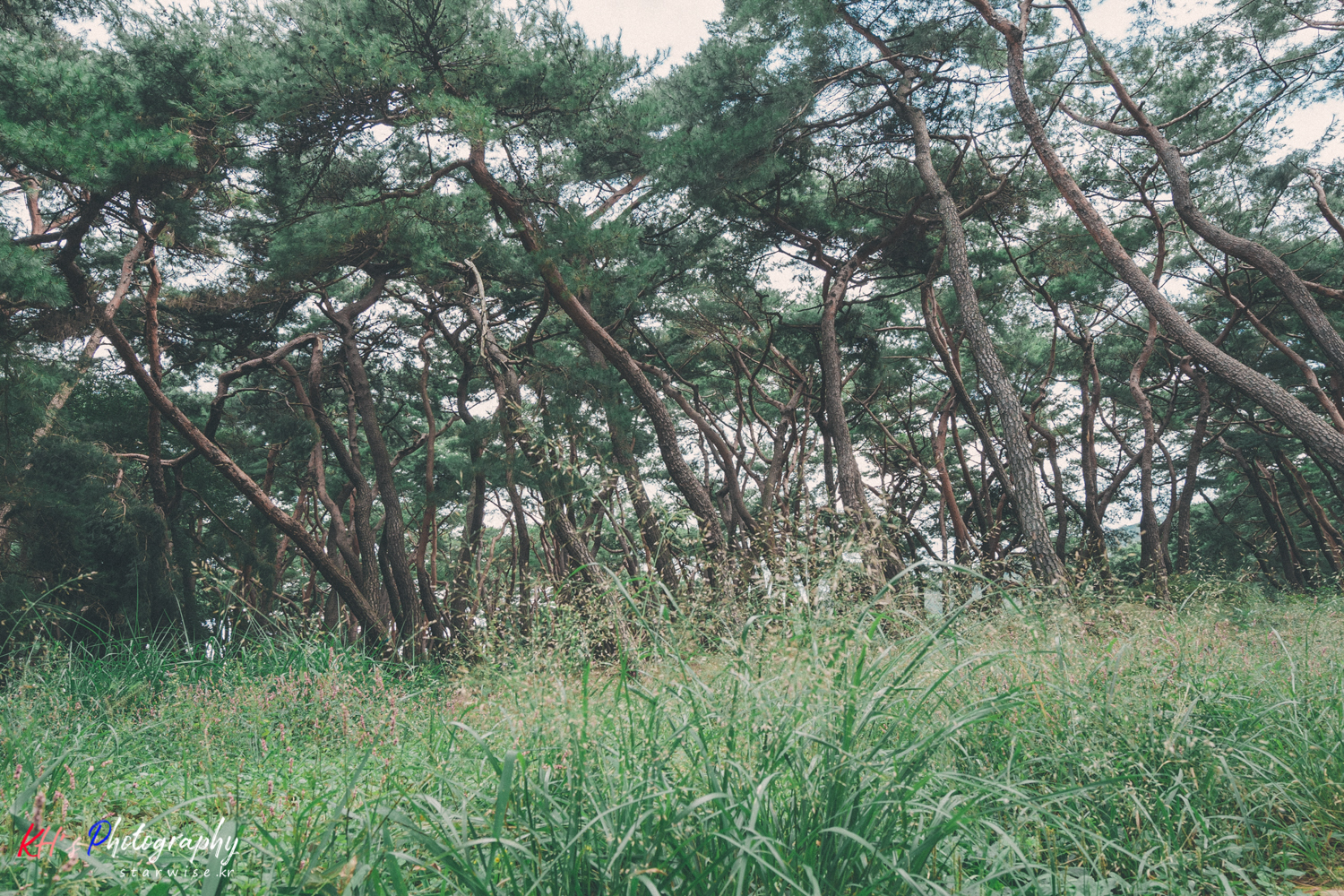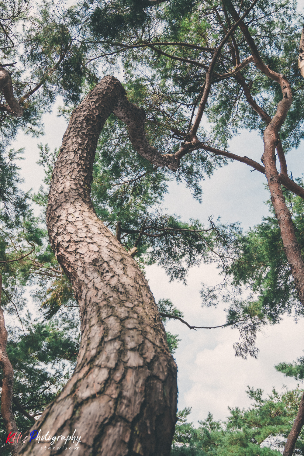 처음에 내려서 삼릉숲을 향할 때는 내가 뭔가 등산을 시작하는 느낌이 들었다. 입구가 흡사 제주에서의 오름 입구와 많이 닮아 있었기 때문이다. 숲으로 가는, 수풀이 우거진 좁은 길을 지나고 나니, 하늘을 향해 구부정하게 펼쳐진 여러갈래의 나무가 눈 앞에 펼쳐지고 있었다. 신비로움....이랄까? 마치 조선시대의 숲으로 돌아가는 느낌이다. 제주에도 이렇게 하늘을 향해 펼쳐진 나무들은 많지만 한결같이 쭉쭉 일자로 뻗어 있어 그냥 높다는 느낌이다. 그런데 이 곳에서 바라본 나무들의 모습은 하늘을 향해 뻗어가다가도 왼쪽으로 오른쪽으로 휘어져 있거나 꼬여있는 모습...그리고 나무가 위로만 향하는게 아니라, 왼쪽 오른쪽으로 누워서 자라다가 위를 향하는 경우도 자주 볼 수 있었다.