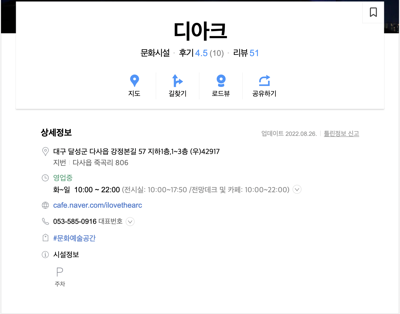 디아크는 2012년 9월 20일에 개관한 문화관 / 미술관이라고 하는데 정식 명칭은 "디아크 문화관"이라고 한다. 지하 1층~3층으로 구성되어 있고 1층에는 전시실이 있고 이 외에도 세미나실,다목적실이 있으며 3층엔 전망대와 카페가 있는데, 이곳에서는 낙동강과 금호강을 한눈에 볼수 있다고 한다. 세계적인 건축가인 하니 라시드의 작품이라고 하는데, 그의 대표적 작품은 네덜란드 암스테르담의 히드라 피어, 그리고 아랍에미리트의 야스호텔이 있다. 디아크의 건축 컨셉은 잔잔한 물 위에 돌을 튕겨 만드는 물수제비, 수면 위로 뛰어오르는 물고기, 한국의 전통 도자기인 막사발 이라고 한다. 건축물 하나에 엄청난 창의적인 아이디어가 녹아있는 셈이다.