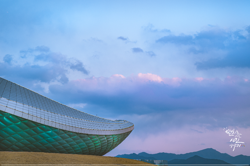 신기하게 생긴, 마치 SF영화에서나 볼법한 유선형의 모양새를 띈 디아크 조형물은 사실 그냥 조형물이 아니라 안에 들어가볼 수 있는 건축물이다. 그래서 내부엔 간단하게 볼 수 있는 전시관이 위치하고 있는데, 나는 사실 안에는 관심이 없었고, 그냥 평범하게 맑은 날의 디아크를 담아보고 싶었던 것이 아니라, 붉은 석양이 지는 하늘과 함께 건축물에 들어오는 조명을 함께 담아보고 싶었다.