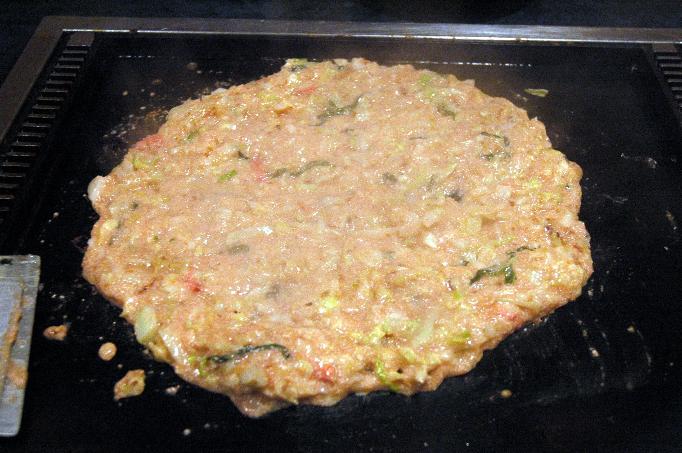 서쪽인 간사이 지방에 "오코노미야키"와 다르게 동쪽지방인 간토는 몬자야키가 있는데 비주얼은 별로이지만 특색있는 음식을 먹어보자는 마음으로 한번 먹어보기로 했다. 오른쪽의 몬자야키의 모습은 놀랍게도 조리 중인 게 아니라, 완성된 모습이다. 뭔가 밀가루 반죽같이 보이는 상태로 먹는다. 철판에 조리가 완성되면 위쪽은 걸쭉하게 그리고 밑면은 바삭하게 익어서 바삭함과 푹신함(혹은 꾸덕함이라고도 한다.)을 동시에 느껴볼 수 있는 음식이라 할 수 있다. 몬자야키는 "오코노미야키"처럼 잘라서 먹는 것이 아닌 조금씩 덜어서 앞접시에 먹게 되는데, '테코(テコ)' 혹은 '코테(コテ)' 라고도 불리는 손가락 길이 정도의 작은 몬자야키 전용 주걱, 즉 몬쟈베라(もんじゃベラ)인 하가시(はがし)를 이용해 철판에 있는 위 사진의 상태 그대로 한 입 크기만큼씩 잘라먹는다. 이를 이용해 몬자야키를 콕 찔러보면 딱 한 입 크기로 알맞게 잘 떨어진다.