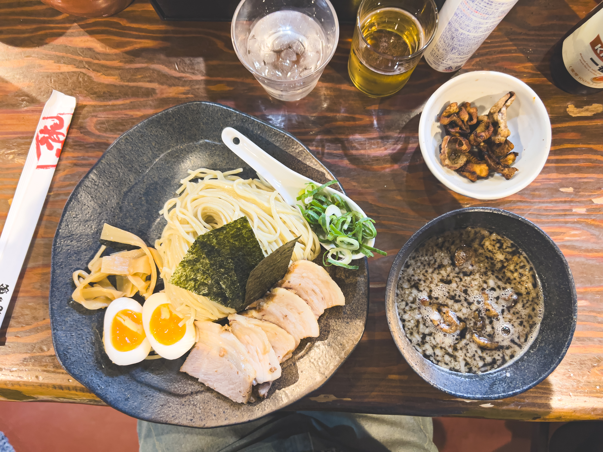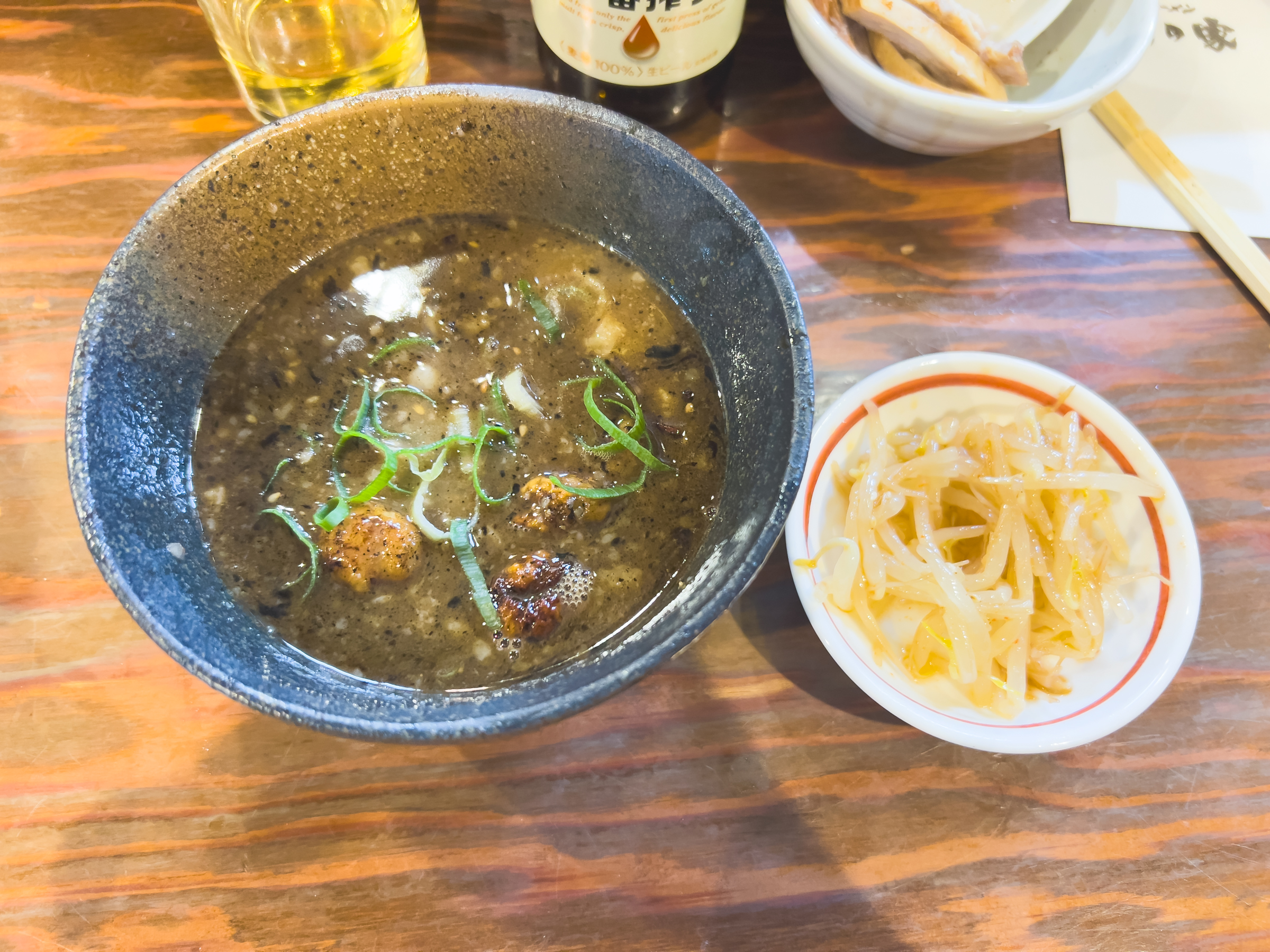 주문한 라면은 "츠케멘"이었기 때문에 소스가 함께 온다. 혹시 모르시는 분들을 위해 설명하면, 츠케멘은 마치 소바를 간장에 잠깐 담갔다가 먹듯이 간이 쎈 소스에 잠깐 담궜다가 먹는 일본식 라멘이다. 그래서 국물이 있는 일반 라면과는 또 다른 맛인데, 이곳은 모츠(곱창)가 들어갔기 때문에 츠케멘 소스에 곱창이 몇 조각 있다.
