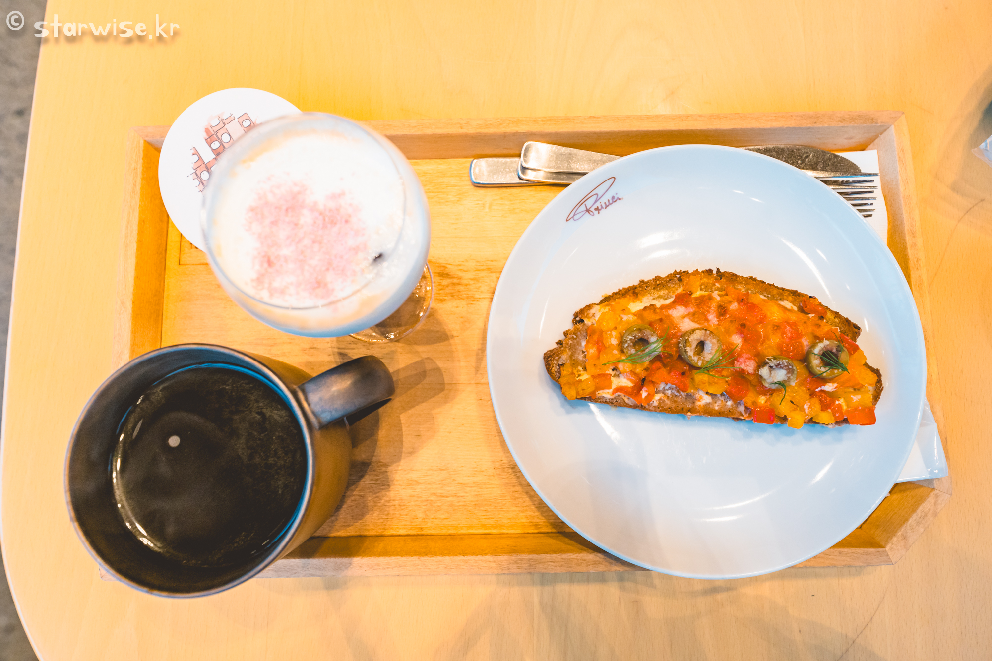 맛있어 보이는 피자빵 같은 디저트메뉴와 함께 커피를 주문해 본다. 아침부터 취하긴 싫으므로, 뜨아 1잔 그리고 셀린 아이리쉬 커피를 주문해본다. 물론, 양에 비해서 가격이 조금 나가긴 하지만 자리값이다... 생각해 보면 이해는 가능한 가격이다.