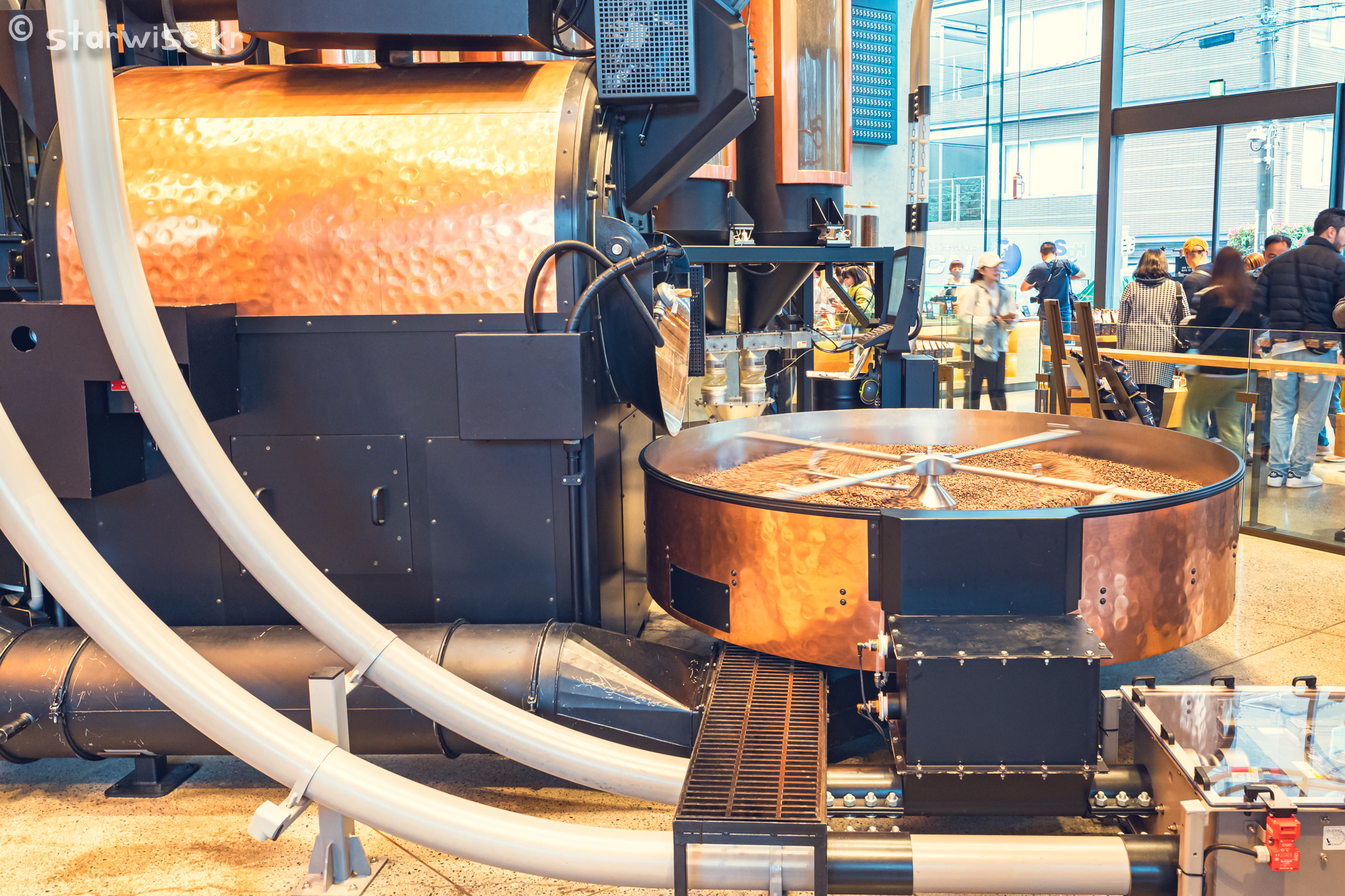 메인 홀에 있는 로스팅 기계이다. 그냥 상징적으로 만든 전시물인 줄 알았는데 실제로 생두(볶기 전 커피콩)를 뜨거운 증기로 볶고 있는 중인 기계였다. 그냥 알아서 볶아지도록 내버려 두는 것이 아니라 옆에 바리스타가 상주하면서 직접 커피가 볶아진 정도 색, 향 등을 점검하면서 기계를 조작하는 중이었다. 진짜로 커피 공장인 셈이다..!!