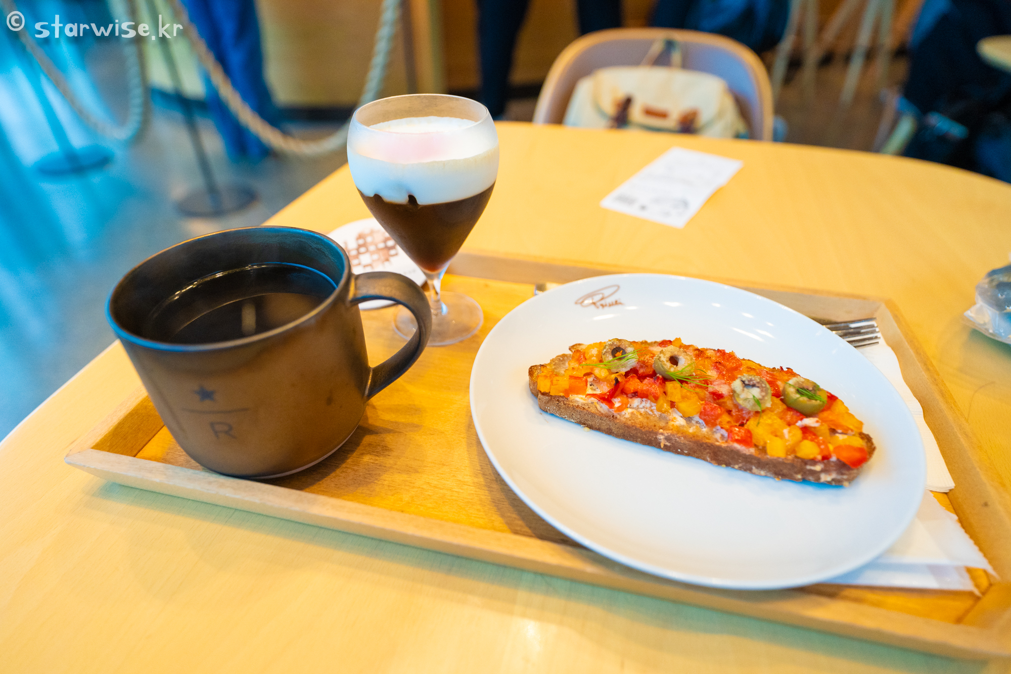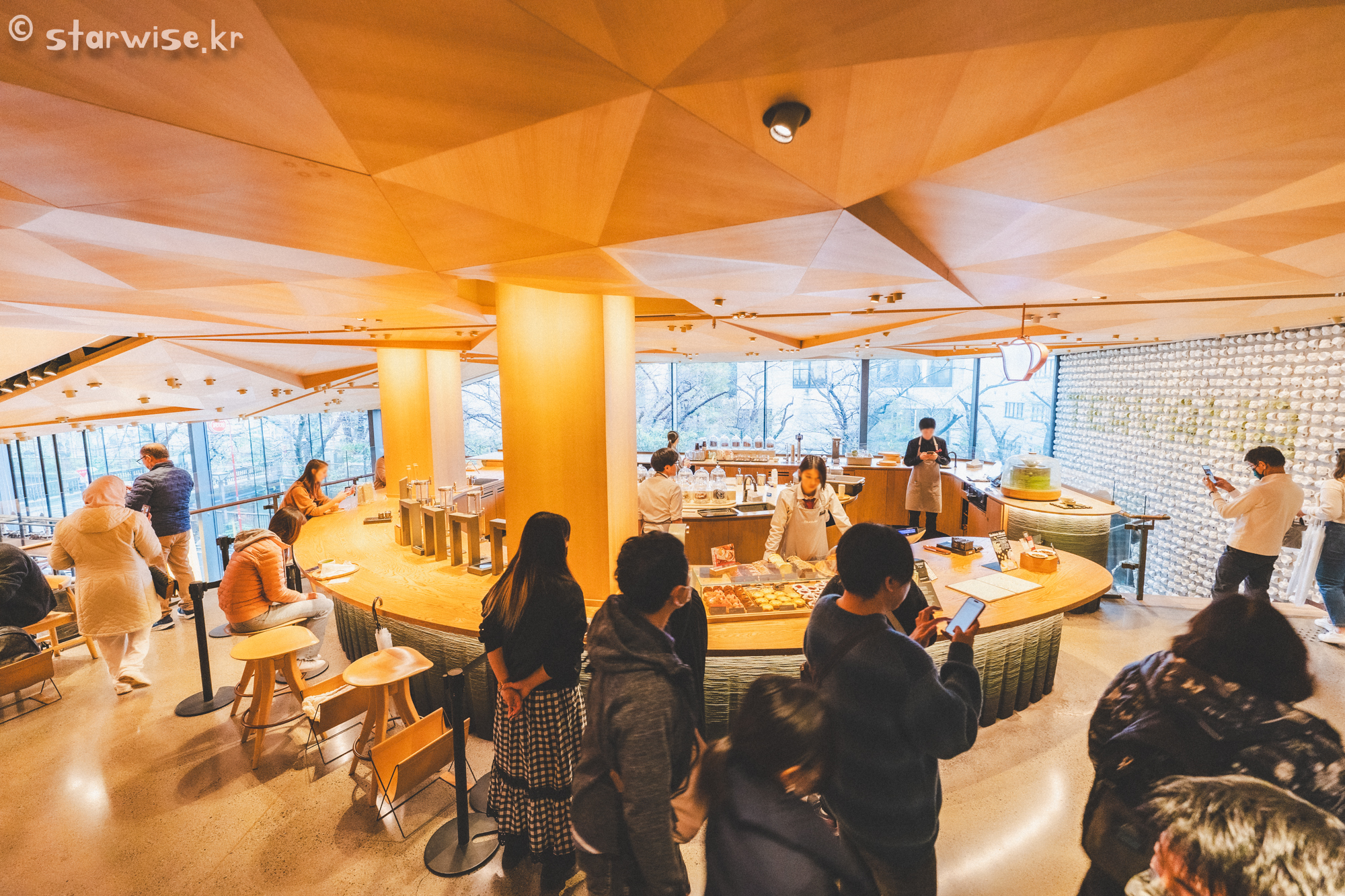 3층까지 있는 거대한 이 건물은 하나의 예술품이자, 문화공간 그리고 차를 달여마시고 맛난 디저트도 만나볼 수 있는 종합문화 공간이다. 단순한 카페가 아닌 것이다! 그래서 전 세계에서 사람들이 몰려들기 때문에 오픈런을 하는 사람들도 종종 볼 수 있다. 필자가 방문한 날에 비가 추적추적 내리고 있었고 대략 9시 반쯤 방문했는데 다행히도 입구부터 대기는 아지 않고 바로 입장할 수 있었다. 그리고 빠르게 앉을 자리부터 수색해서 짐을 놓고 그 다음에 주문을 하러 이동했다. (참고로 스타벅스는 음료주문하지 않아도 매장이용 + 화장실 이용할 수 있다! 전세계 방침)