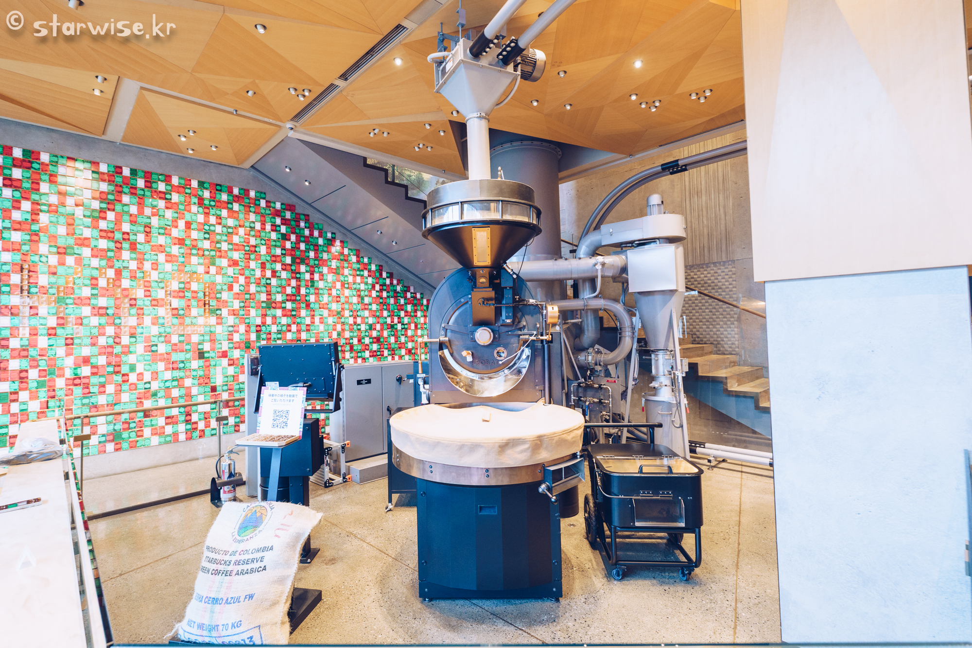 메인 홀에 있는 로스팅 기계이다. 그냥 상징적으로 만든 전시물인 줄 알았는데 실제로 생두(볶기 전 커피콩)를 뜨거운 증기로 볶고 있는 중인 기계였다. 그냥 알아서 볶아지도록 내버려 두는 것이 아니라 옆에 바리스타가 상주하면서 직접 커피가 볶아진 정도 색, 향 등을 점검하면서 기계를 조작하는 중이었다. 진짜로 커피 공장인 셈이다..!!