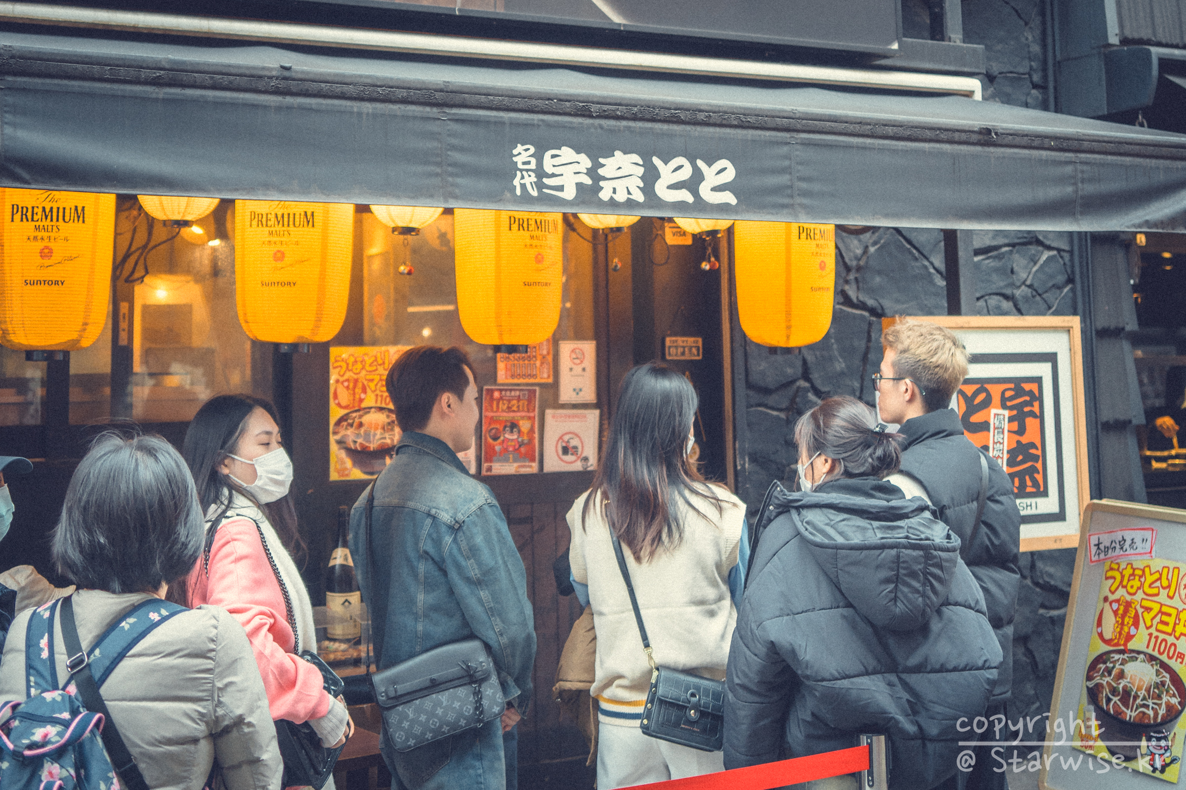 생각보다는 대기줄이 적은 것으로 보였다. 10-15명 내외로 대기하고 있었으니 대략 2-30분이면 들어갈 수 있지 않을까? 하는 기대감이 있었던 것도 사실이다. 기다리고 있는 사람들 중엔 중국인 관광객이 대다수였지만 점심 먹으러 동네 가게로 온 진짜 일본 직장인도 보였다. 양복차림에 가방을 매고 있는 사람이었기 때문에 그렇게 추정할 수 있다. 장어덮밥이라는 게 젊은 사람들에게는 별로 인기가 없는지 관광객(중국어를 하고 있었기 때문에 안다..단체였다!) 들은 죄다 중장년층이었고 모두 한결같이 비슷비슷한 밝은 계열의 등산재킷을 입고 있었다.