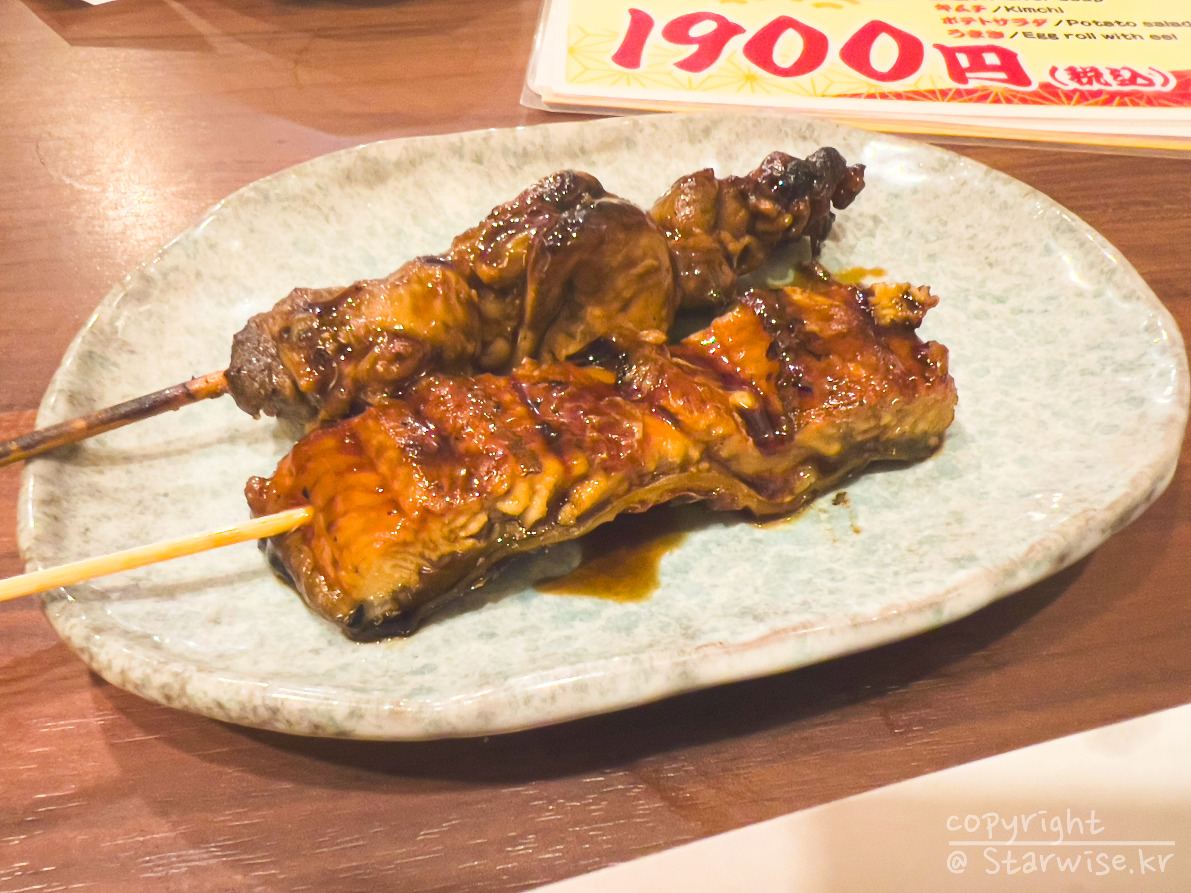 세트메뉴로 나온 것 중, 레몬사와는 아는 맛이였고... 뼈튀김 또한 살짝 더 기름져서 느끼했던 것 빼곤 보통인 맛이었다. 그리고 함께 나온 꼬치 2종. 대충 눈대중으로 맛있겠지..하고 모르고 주문해본건데 하나는 일반적인 양념장어 꼬치였다. 덮밥에 올려져 있는 것과 크게 다르진 않았는데, 위쪽에 보이는 히레(?)가 문제였다. 나중에 찾아보니 장어 지느러미라고 하는데 계속 야들야들한 것들만 먹어서인지 상대적으로 질기고 잘 끊어지지가 않아서 이거 뭐야?! 염통이야? 라고 생각했던 꼬치였다. 음료가 포함이라는 부분에서 추천할만 한 안주세트라고 생각한다!