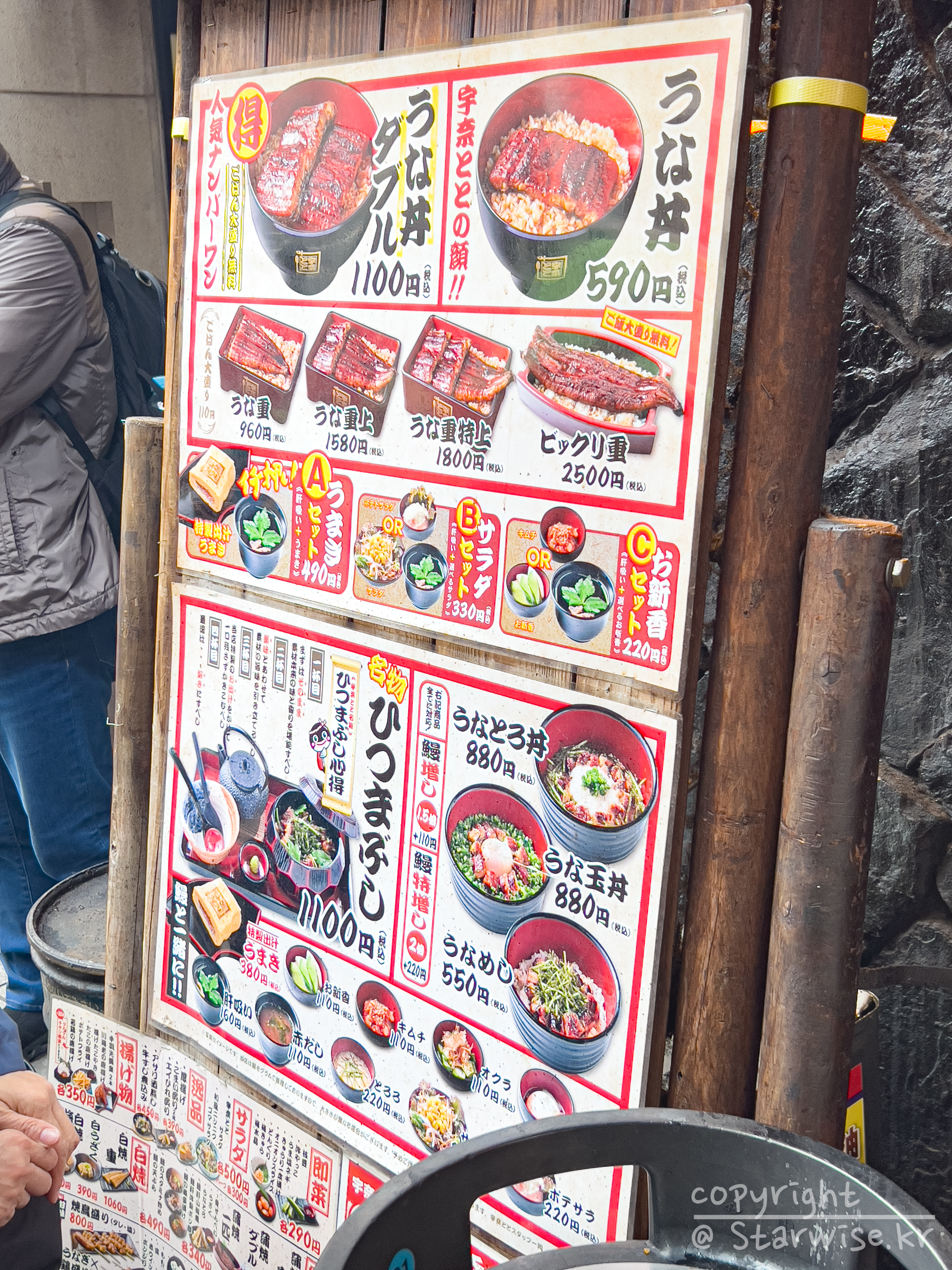 히라가나도 겨우 읽을 수 있는 나로써는, 가타카나가 너무 어려운 거 같다. 여러 번 외워보려고 시도했지만 막상 일본 도착해서 메뉴판을 읽어보려 했더니 머리에 남아 있는 단어가 없다. 인터넷으로 열심히 검색해 본 결과, 히츠마부시보다는 우나동 곱빼기를 먹으라는 얘기가 많아서 그렇게 먹어보기로 마음먹었다. 일본은 기본적으로 반찬이 없기 때문에 반찬은 따로 주문해야 한다..!! (이곳은 소위 자릿세라고 하는 오토시(お通 とお し)는 없다!)