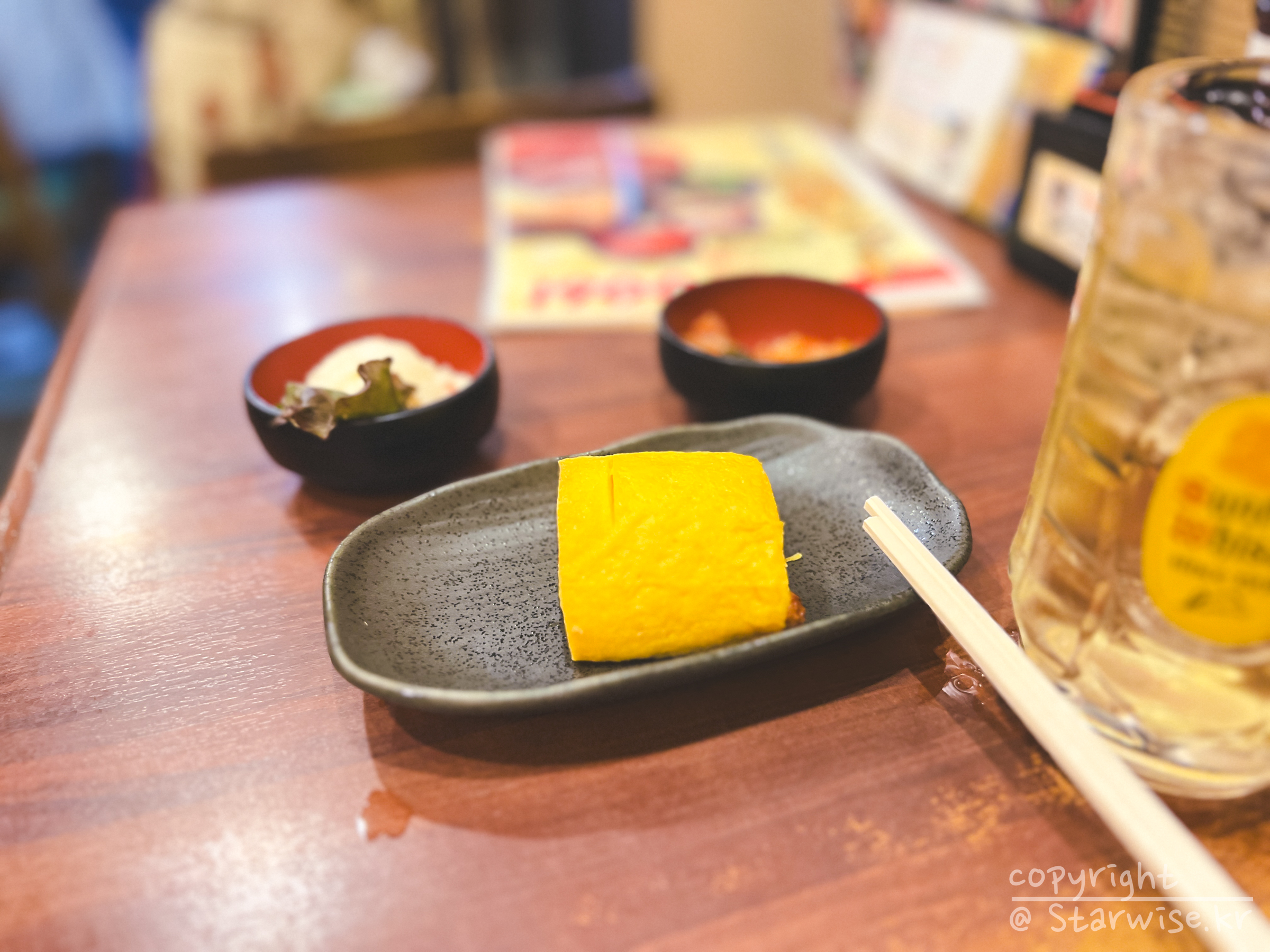 역시, 하이볼은 가쿠빈 하이볼이다. 맥주의 탄산이 조금 지루하다면 하이볼로 위를 코팅(?)해 보는 것도 하나의 별미라고 생각한다. 장어 덮밥은 주문 즉시 연탄에 굽기 시작하는 것 같다. 그래서 시간이 조금 걸리는 듯한데 제일 먼저 나온 음식은 김치와 감자샐러드. 사실, 가타카나 못읽어서 채소무침 주는줄 알고 먹었다가 "응? 이건 익숙한 맛인데?" 생각이 들어 떠듬떠듬 읽어보니 김치였다는... 흔하디 흔한 맛이였지만, 바로 다음 나온 장어 계란말이는 먹어보지 못한 맛이었다.