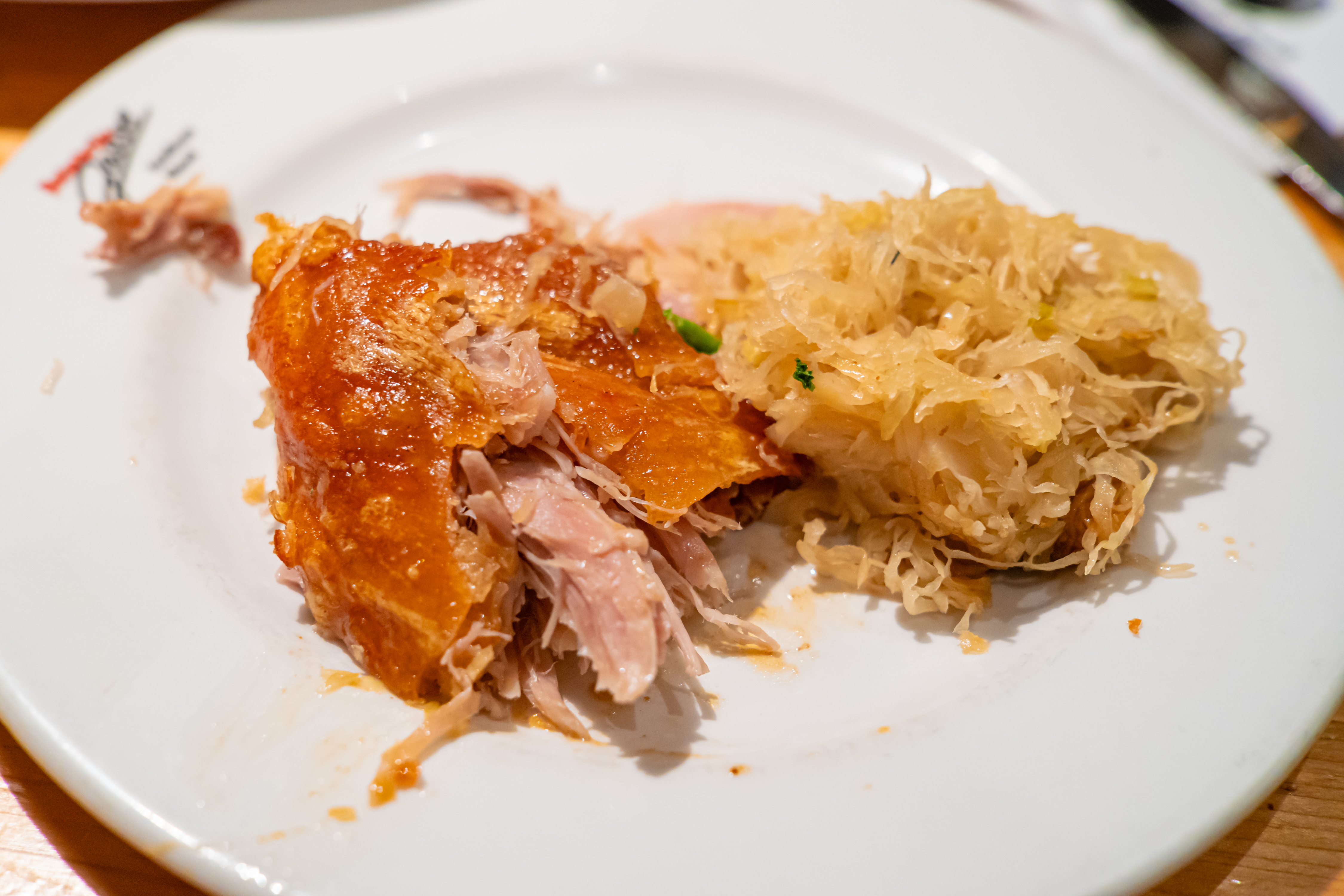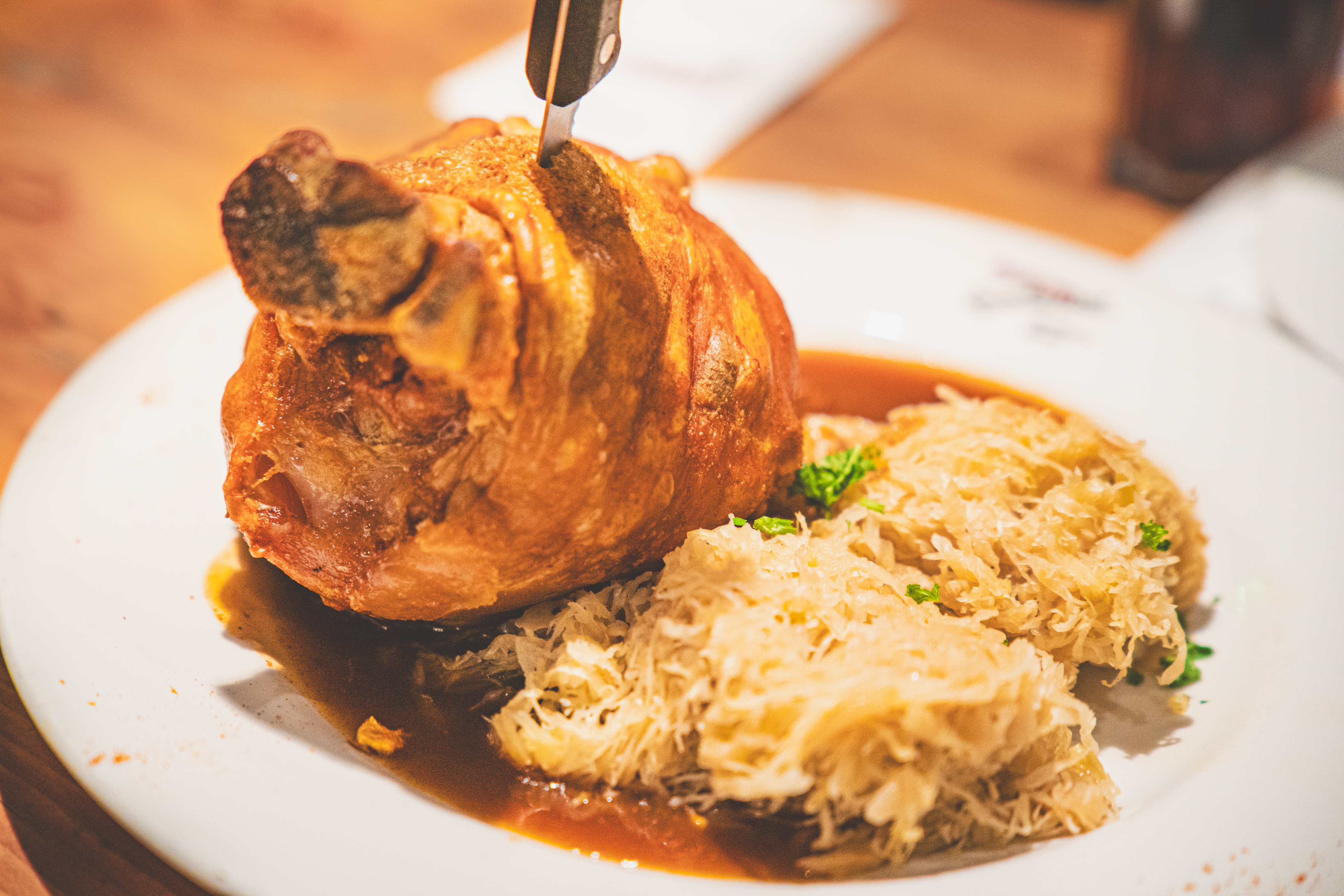 그래서 보통 안주로 먹고, 독일 양배추절임인 자우어크라우트와 함께 먹나 보다. 서빙은 저렇게 덩어리로 나오기 때문에 사진 속 해체용칼(?!)을 들어서 직접 썰어야 한다. 그렇지만 겉바속촉이기 때문에 해체 난이도는 낮은 편!