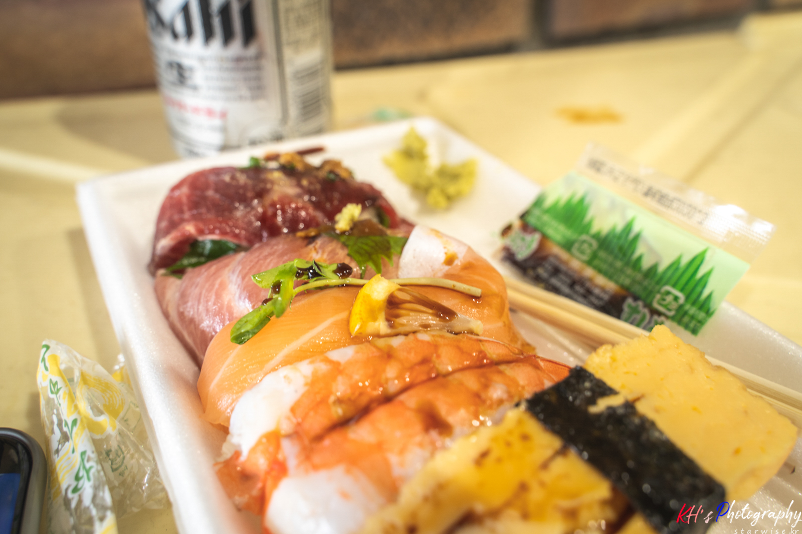 한바퀴를 돌고, 두바퀴째 돌았는데 차이점을 모르겠다.. 그래서 그냥 제일 눈에 들어오는 곳으로 가서 이거이거이거 주세요! (고레 고레 고레~ 쿠다사이) 해서 주문 완료! 이런 맛있는 음식에는 술이 빠질 수 없기 때문에 지나가는 길에 있는 음료수 점에 가서 "비루 쿠다사이!" 외치고 먹을 수 있는 곳을 찾아보는데 와...진짜 자리라는 자리는 죄다 사람들이 앉아있다. 심지어 복도에 그냥 앉아서 먹는 사람도 많았고 난간에 기대어 먹는 사람, 제대로 된 테이블에서 먹는 사람... 멈춰서 먹을 수 있는 곳은 모~~두 빼곡히 앉아 있어서 한참을 돌다가 겨우 난 계단 앞 박스 판자 위에서 겨우 놓고 음식을 먹을 수 있었다. (밖에서 먹을수도 있었지만 비바람이 너무 심해서...눈물젖은..아니 바닷물+빗물 젖은 초밥을 먹고 싶지 않으면 나가서 먹을수가 없었다.)
