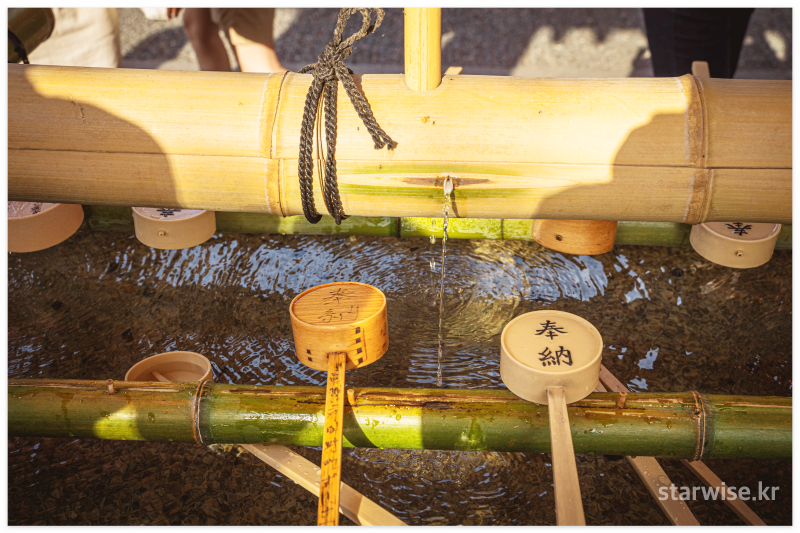 신성한 신사를 들어가기 위해 몸을 정화하기 위해 만든 곳이므로 손을 씻는 용도이다! 정화하는 의식을 행하는 곳이므로 물이 결코 비위생적인 것은 아니지만, 약수터 물에 익숙한 한국 사람이 가면 가끔 마시는 경우를 많이 봤기에 이 기회를 빌어 한번 더 적어본다. 꿀꺽꿀꺽 삼키면 옆에 있는 일본인이 이상하게  볼 수도 있다.