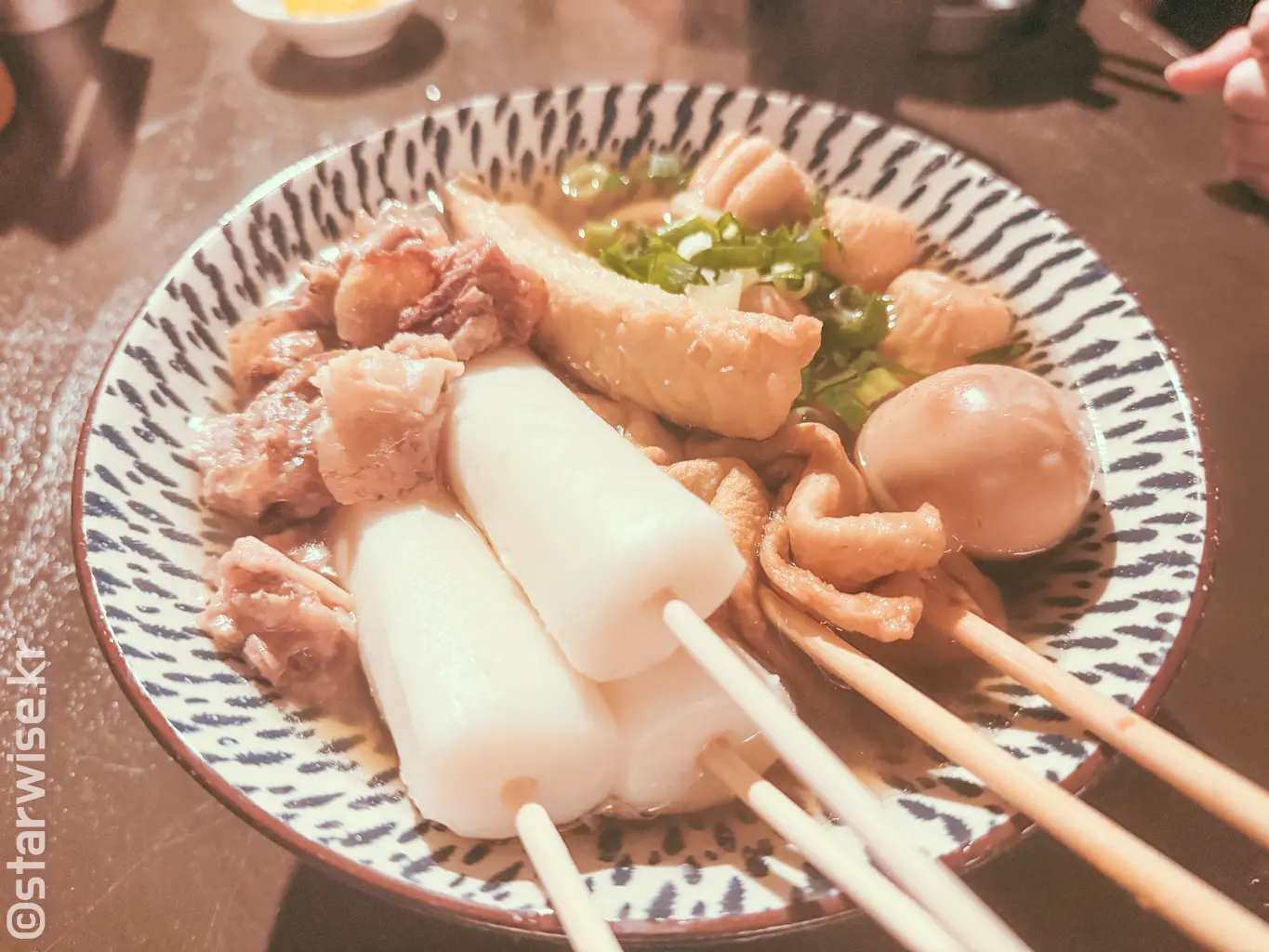 2차로 가기에는 두 명 이상이 좋고 저녁식사로 먹기엔 적당한 양의 '오뎅 한 그릇'이곳의 메뉴이다. 필자 추천하는 바로는 반드시 스지와 물떡은 추가해 볼 것을 권한다! 주문과 동시에 눈앞의 커다란 네모난 모양의 냄비 속에서 뜨끈한 국물과 피어오르는 수증기의 따스함을 느껴볼 수 있을 것이다.