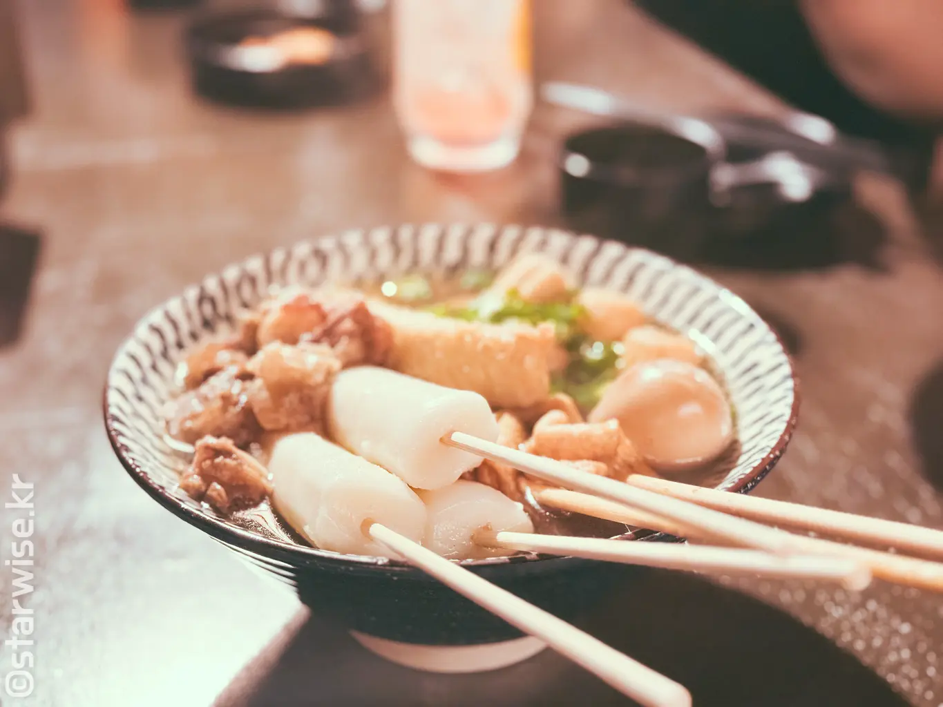 2차로 가기에는 두 명 이상이 좋고 저녁식사로 먹기엔 적당한 양의 '오뎅 한 그릇'이곳의 메뉴이다. 필자 추천하는 바로는 반드시 스지와 물떡은 추가해 볼 것을 권한다! 주문과 동시에 눈앞의 커다란 네모난 모양의 냄비 속에서 뜨끈한 국물과 피어오르는 수증기의 따스함을 느껴볼 수 있을 것이다.