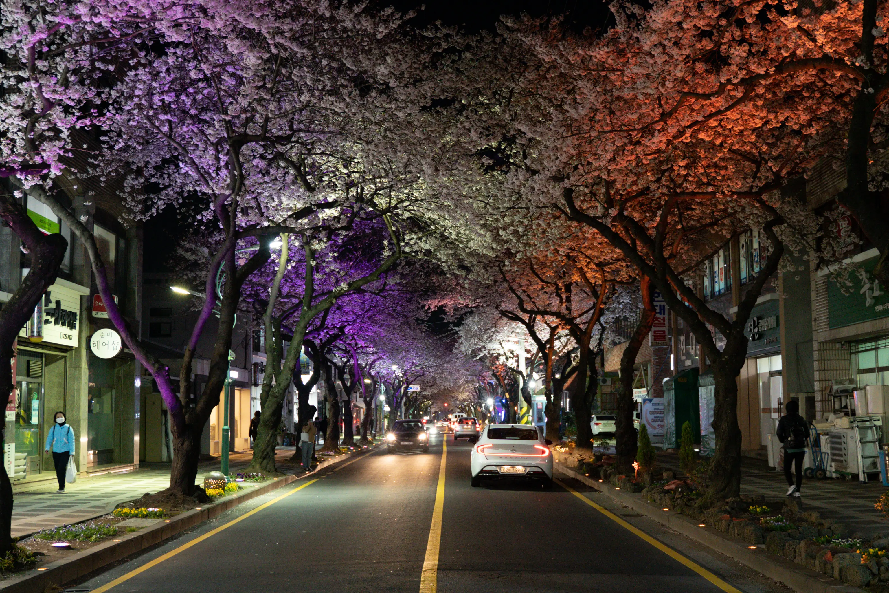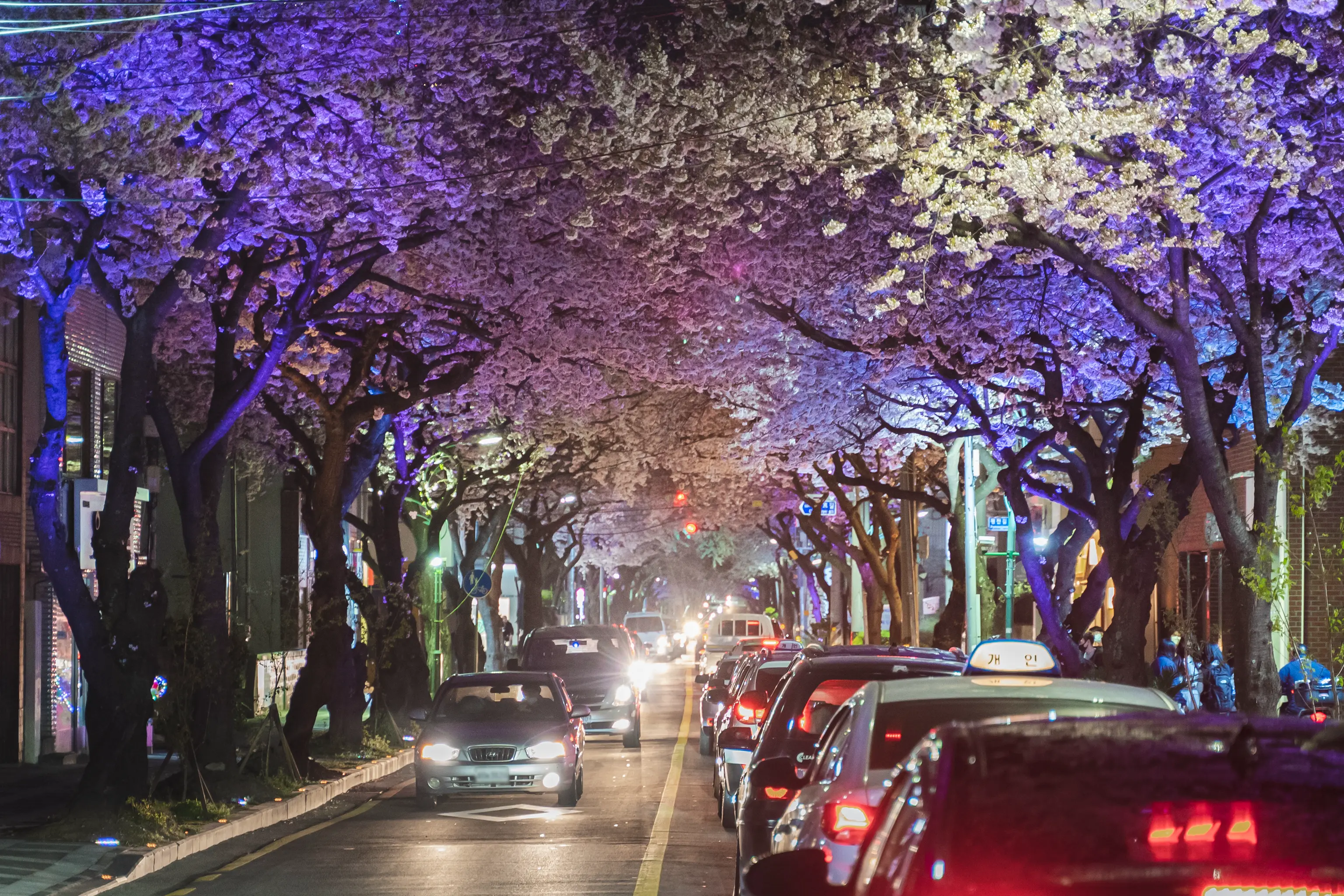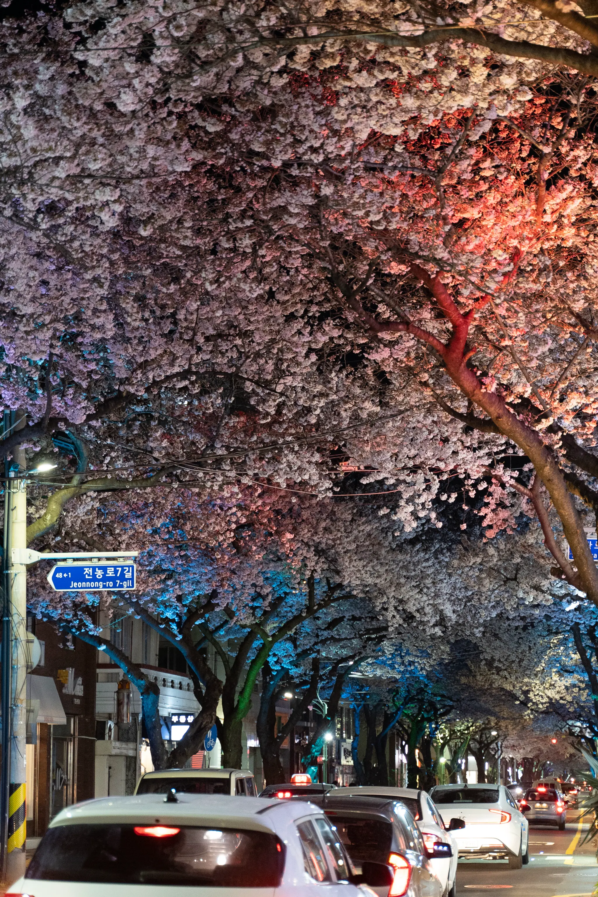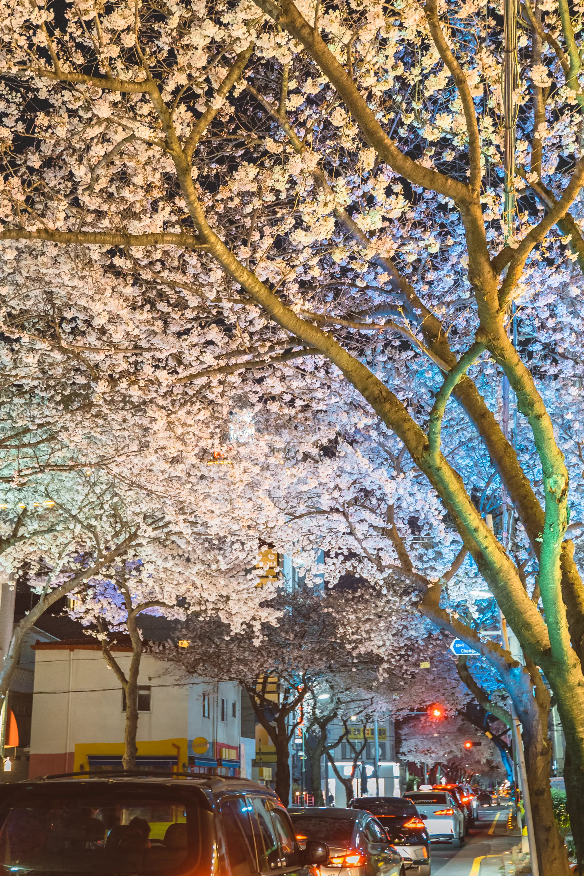 그냥 흰색의 가로등만이 거리를 지키는 것이 아니라 형형색색의 다른 색의 LED등이 거리를 가득 매운 벚꽃을 한층 더 화려하게 만들어준다. 벚꽃을 테마로 한 라이트쇼가 펼쳐지는 것이다!