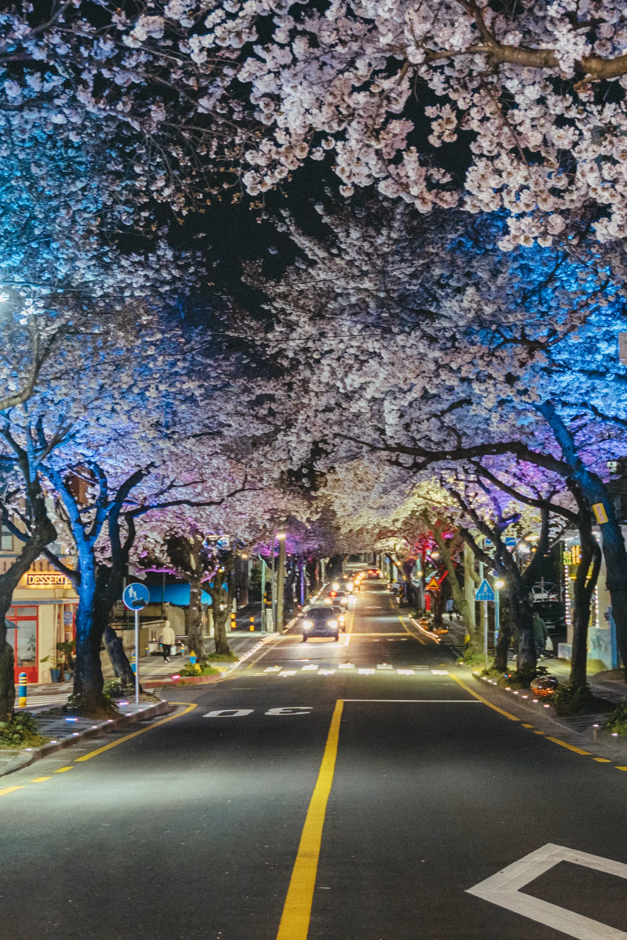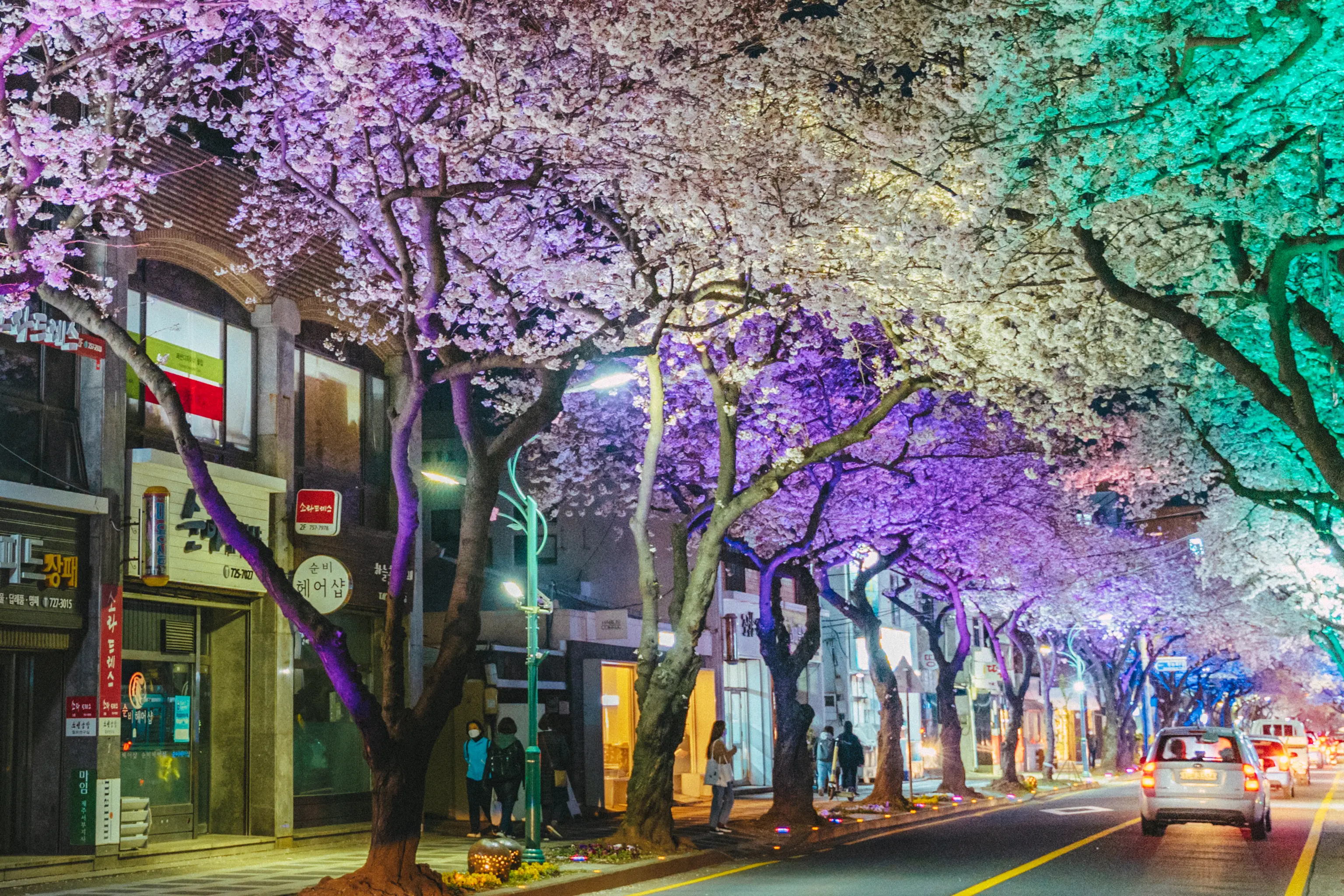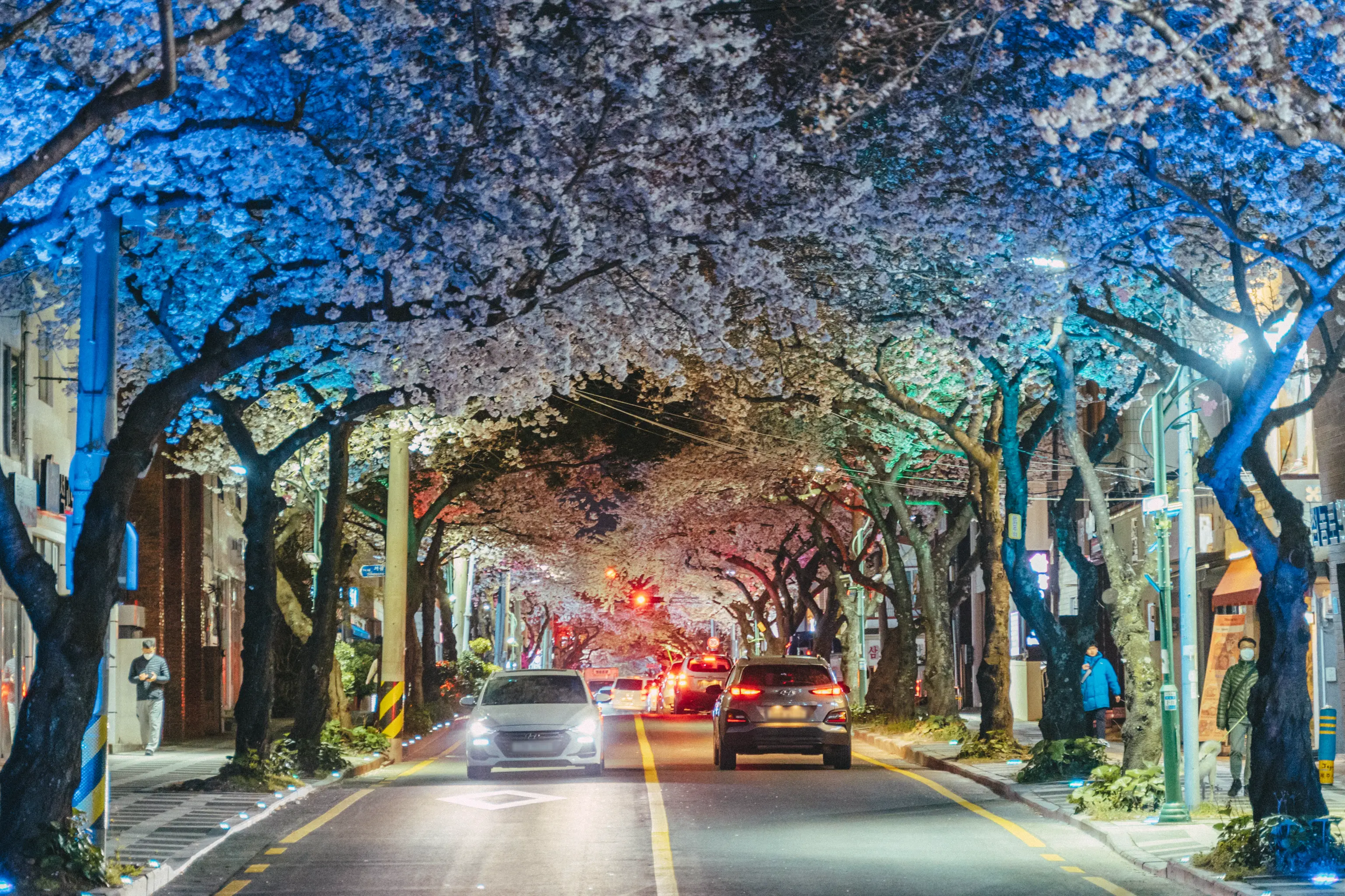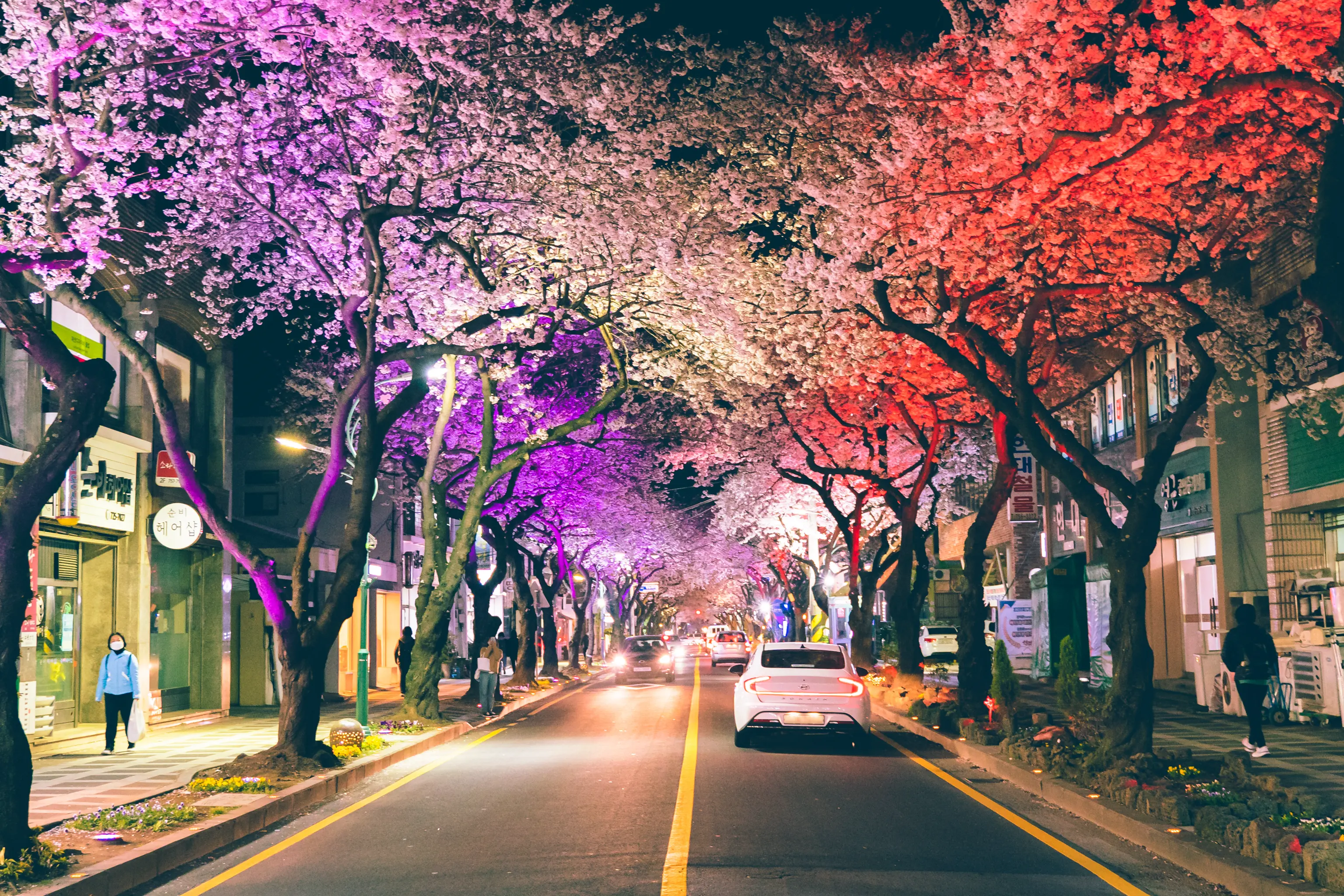 그냥 흰색의 가로등만이 거리를 지키는 것이 아니라 형형색색의 다른 색의 LED등이 거리를 가득 매운 벚꽃을 한층 더 화려하게 만들어준다. 벚꽃을 테마로 한 라이트쇼가 펼쳐지는 것이다!
