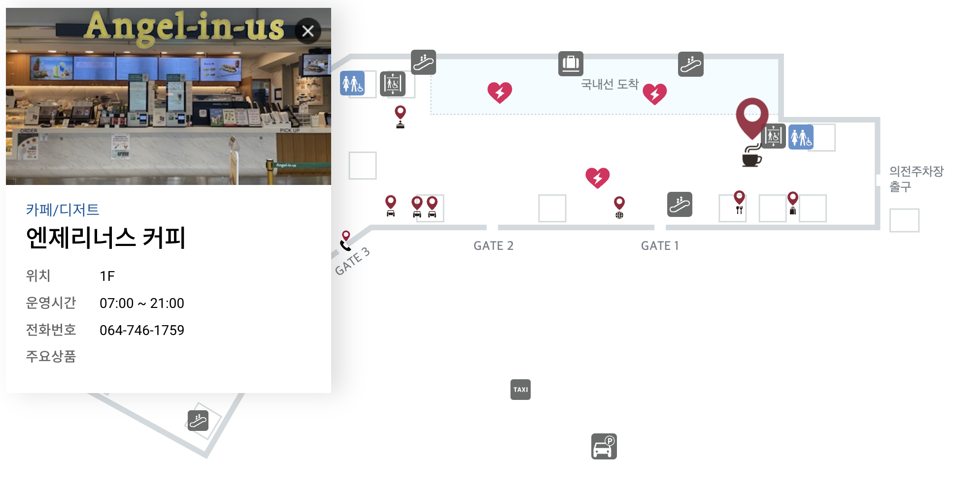 제주 공항에는 다양한 편의 시설들이 준비되어 있다. 그렇지만 상대적으로 조용하고 사람이 없는 곳을 찾는다면 1층의 엔젤리너스 카페를 이용하면 좋다. 약간은 구석진 곳에 있기 때문에 사람들이 잘 알지 못해서 조용하다.