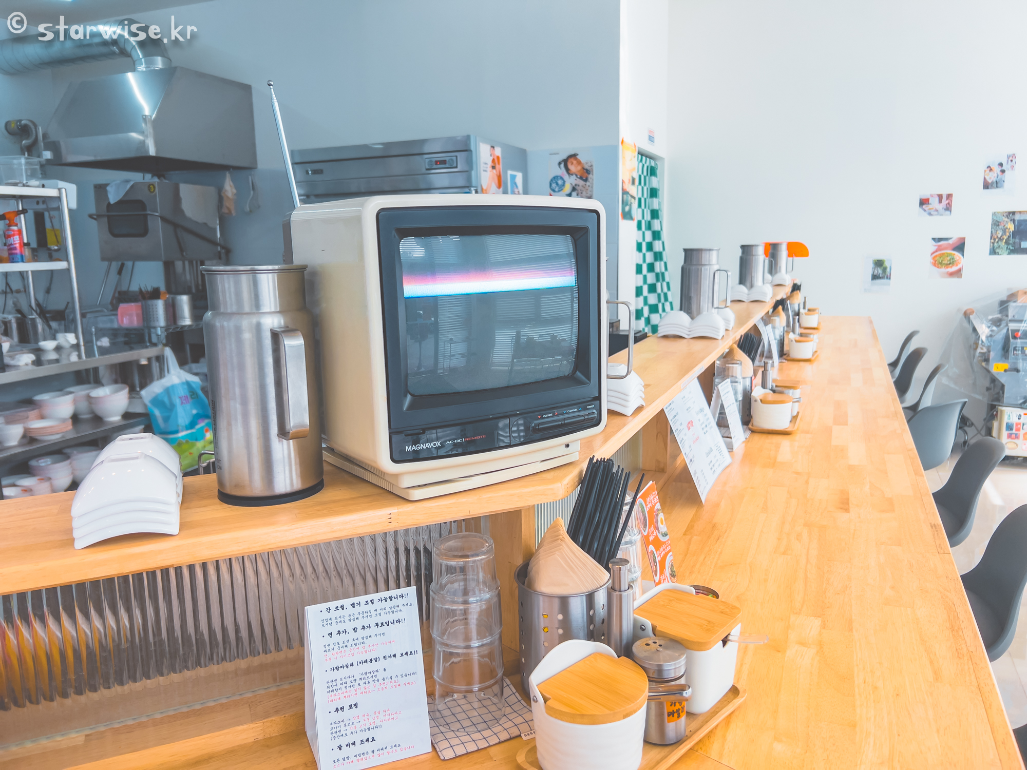 내부를 깔끔하게 단정해놓기는 했지만, 일본의 감성을 한 스푼 얹여서 중간중간 오래된 CRT 티비라던지 일본어가 써진 포스터 그리고 사진들을 전시해 놓아서 아주 잠깐은 일본의 감성을 느낄 수 있었다. 그렇지만 진짜 일본의 라멘집이라면 느낄 수 있는 좁은 공간이 주는 친밀감이나 증기에서 올라오는 따스함은 느낄 수 없었다. 어느 정도는 한국식이 가미된 모습이랄까?