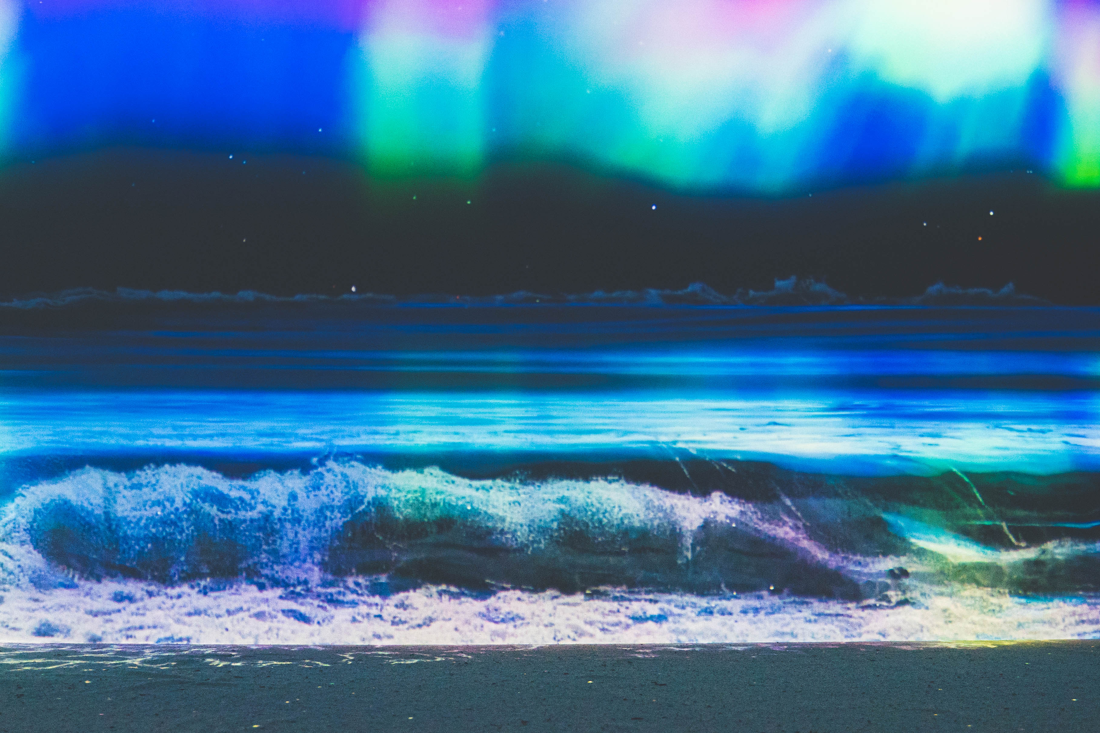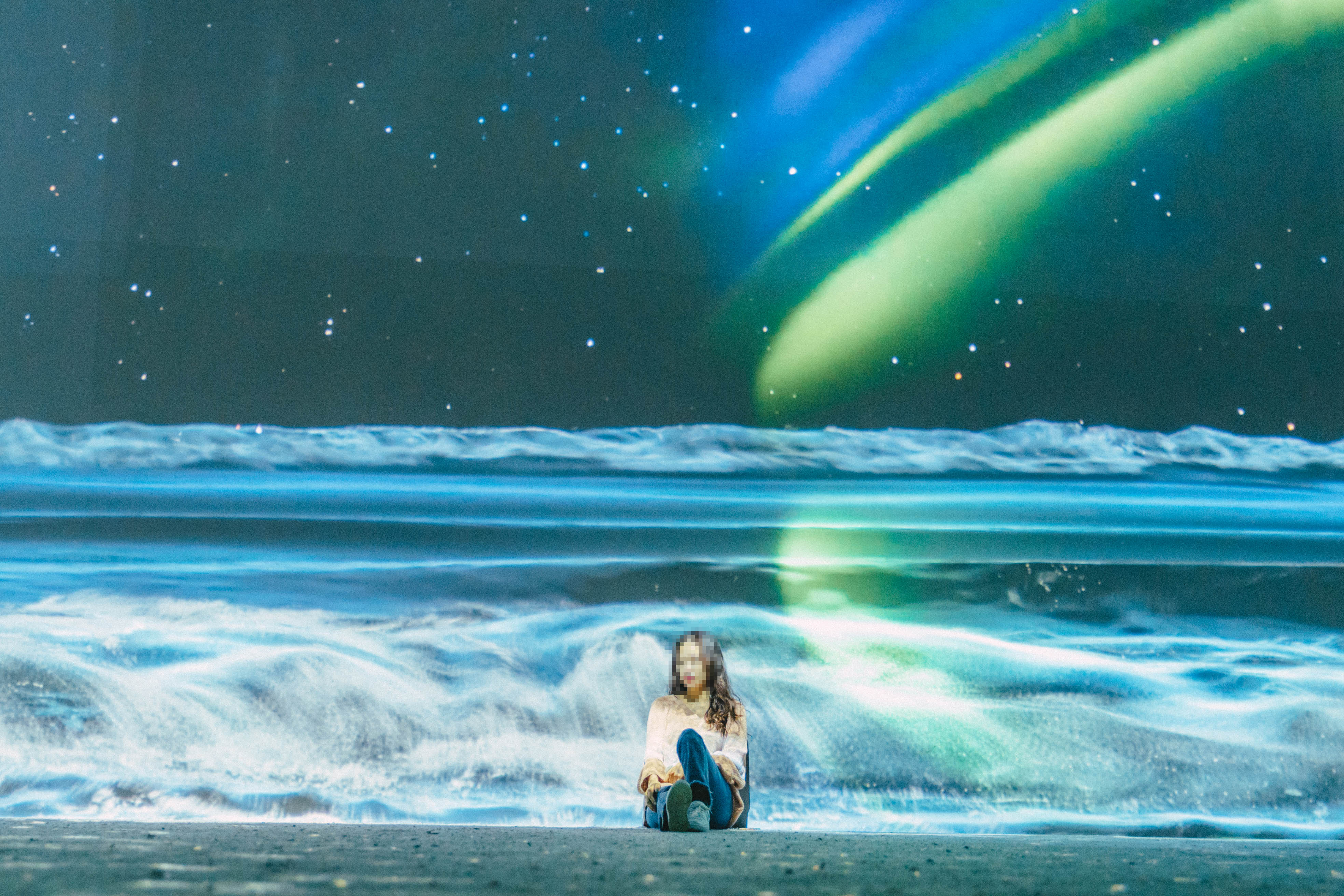 정말 장관이었다. 나중에 본 VR파도모양의 화면에서보다 100배는 리얼하고 차분한 곳이었다. 규모도 훨씬 컸고 말이다. 전시실에 들어가 보게되면 정말 겨울의 저녁바다에서 들릴법한 바다의 물 소리가 들리고 눈 앞에는 수많은 별들이 오로라와 함께 반겨주고 있다.. 일단, 바다의 움직임과 모래의 질감에 놀라고, 전시관의 커다란 규모에 한 번 더 놀란다. 춥지는 않지만 한산하고 여유로움이 묻어나는 곳을 걸어다니는 기분이 든다고 할 수 있다. 사진을 어떻게 남길까...고민하던 찰나, 위를 바라보니 위쪽 프로젝터가 바닥을 향해 있었다. 맞아! 보통 사람들은 파도에만 집중하지 발 밑의 모래에 주목하지 않는다. 모래를 바라보니 그냥 검정색이 아니라 조개껍질도 보이고 흰색 자갈들도 섞여있는 다양한 재료들이 함께 모래의 질감을 만들어 내는 중이었다. 그래서 카메라를 최대한 낮추어서 촬영했다. 모래의 질감도, 파도의 역동적인 모습도, 그리고 하늘에 빛나는 오로라의 아름다움을 한꺼번에 사진으로 담아내고 싶었기 때문이었다. 그래서 나온 것이 위와 같은 사진.... 그냥 아무 사람 없이 찍는 것 보다는 누군가가 고뇌하면서 바다에서 함께 하는 편이 훨씬 보기 좋았기 때문에 부탁해보았다.