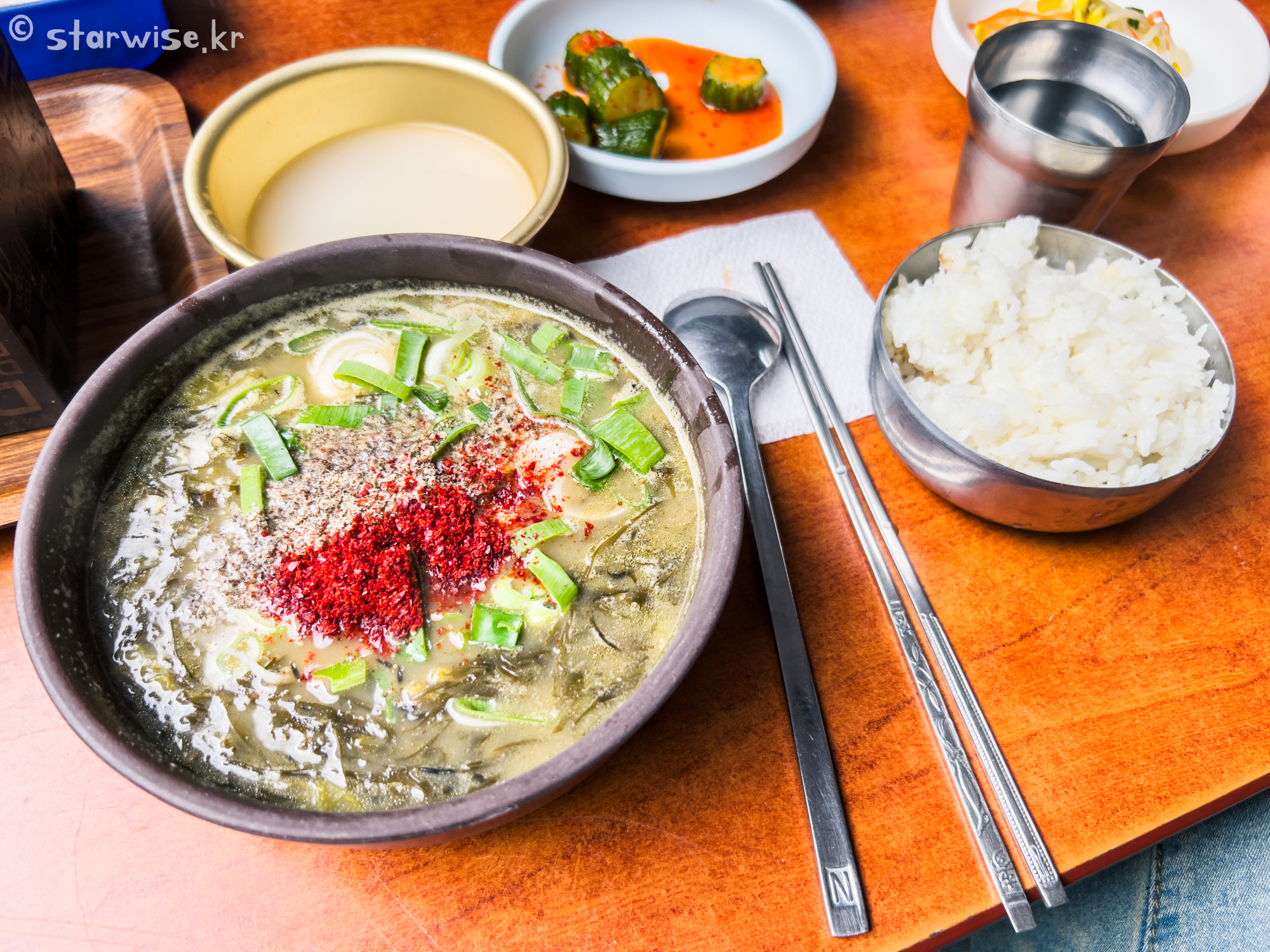 몸국에는, 그리고 국밥에는 빠질수 없는 것이 있다. 바로 막걸리이다. 토속 음식에는 토속 술(제주막걸리)를 마셔줘야 진짜로 즐기는 거라고 생각한다. 국물에는 완전 많이, 충분한 몸이 제공되었고, 한국인에 입 맛에 맞게 고춧가루도 듬뿍 뿌려져 있었다.