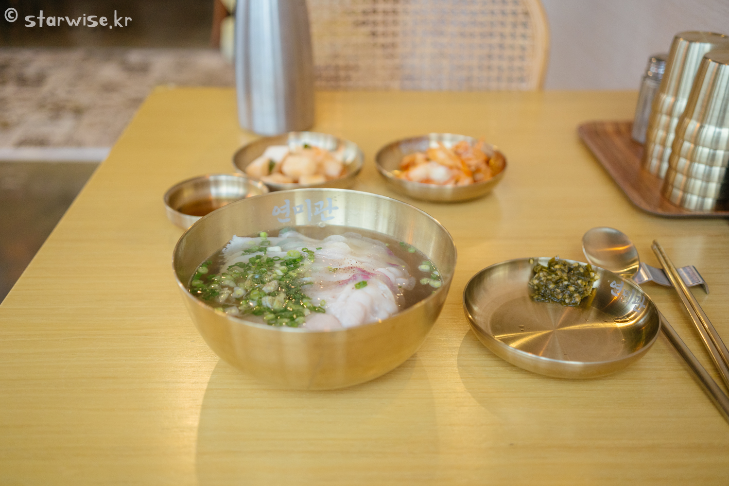 모든 여행이 그렇듯, 예상한 것보다 예상치 못한 사건들이 일어나기 마련이고 맛집 찾는 것도 마찬가지이다. 내가 원래 가려고 마음먹었던 도청 근처의 맛집은 "1명이요." 하는 순간 바로 퇴짜 먹었다.(두고 보자 부들부들..."우리집밥상" 이라고 말 못 한다. 혼밥족을 무시하다니.. 소심하게 악평 남길 거다..!!) 그래서 예전에 리뷰한 적 있는 츄카소바코너라는 곳을 재방문하려 했는데, 바로 옆에 못 보던 식당이 보인다. 라면은 좀 안 당기긴 했는데 마침 뜨거운 국물이 있는 "연미관"이란 곳이 눈에 뜨인다. 바깥에서 볼 때 가게 내부가 엄청 세련되고 깔끔해 보였기 때문에, 음식의 맛도 기름지지 않고 깔끔한 국밥을 기대할 수 있을 거라 생각했다.