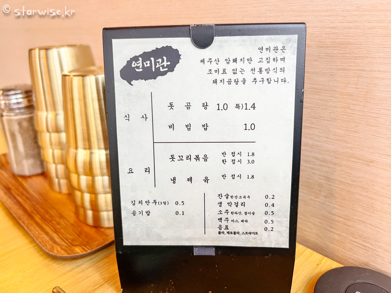 여행의 목적은 사람마다 다르지만, 여행에 있어 특색 있는 음식을 맛보는 것도 중요한 이유 중에 하나라고 생각한다. 그런의미에서 연미관은 제주돼지로 만든 특색있는 국밥이라는 점에서 제주여행의 시작을 알리는 독특한 경험을 선사한다고 생각한다. 이곳에서만 맛볼 수 있는 음식이다. 너무나도 깔끔한 인테리어에 식기류들도 너무나도 단정해서 여긴 100% 체인점이다!라고 생각했는데 보기 좋게 틀렸다. 전국에 딱 1곳, 제주에만 있다. 그래서 더더욱 특별하다. 내가 믿는 카카오지도 기준 평점 5점 만점의 음식점이고 리뷰가 1000개가 넘을 정도면 다녀간 많은 사람들도 인정한다고 생각한다. 그리고, 특히나 제주도청 주변은 점심때 그리고 퇴근 후에 항상 공무원들의 선택을 받아야 하기 때문에 경쟁력도 있다.