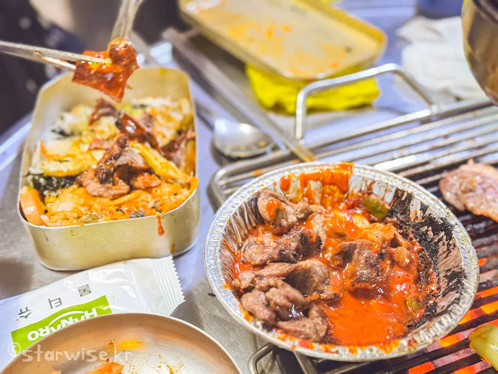 이곳의 시그니쳐 메뉴는 뭐니 뭐니 해도 바로 이 고기! 1인분씩 파는 것이 아니라 1kg 단위로 판매하고 있는 이 때깔 고운 고기뭉치이다. 단일메뉴이기 때문에 부위를 선택할 수는 있어도 (갈매기살/껍데기/모듬) 양념고기로 통일이다. 그만큼 이 공간에 오면 메뉴에 대한 자신감이 엿보이는 부분이다.