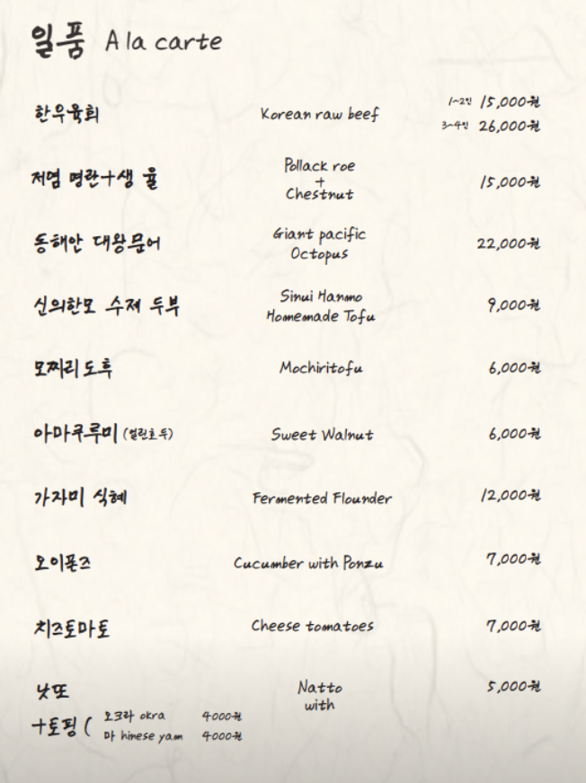진짜 일본의 이자카야와 같이 유료 기본안주인 오토-시(식전 애피타이저 같은 미니 요리)를 선택할 수 있는데 가격이 1500원 밖에 안 하기 때문에 음식이 나오기 전 생맥주 한 잔과 함께 먹기 좋은 음식이다. 처음 오는 사람이라면 메뉴의 첫 번째 사진에 나와 있는 꼬치 세트메뉴를 주문하길 추천한다.