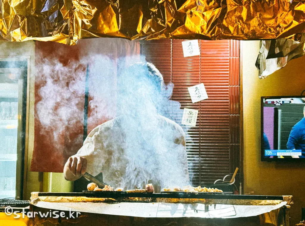 술을 한 두잔 걸치다 보면 눈앞에서 열심히 움직이는 직원분들과 꼬치구이를 열심히 굽고 있는 요리사분의 열정이 느껴진다. 보통 야키토리집을 가면 저렇게 연기가 나지는 않는데 이곳에서는 구워지는 동안 식재료들의 수분증발을 막기 위해 굽는 중간중간에 물을 뿌리기 때문에 저렇게 자욱한 연기가 나는 것을 볼 수 있다. 환풍 시스템이 잘 되어 있기 때문에 가게 내부가 뿌옇게 변하는 불상사가 일어나진 않는다.