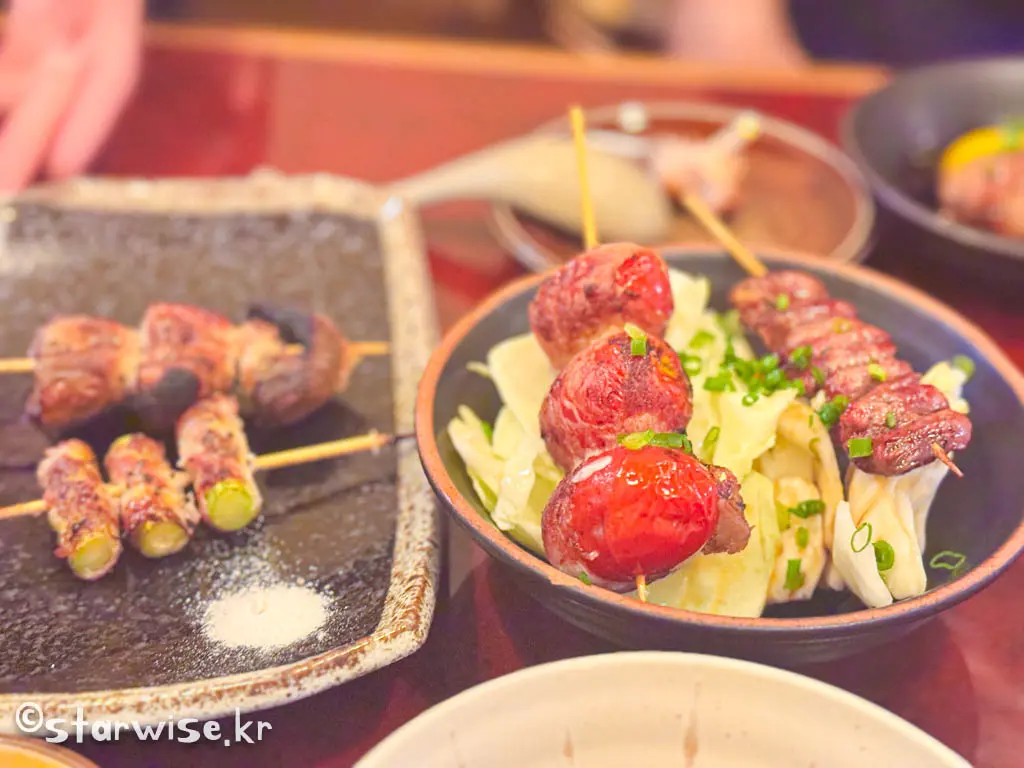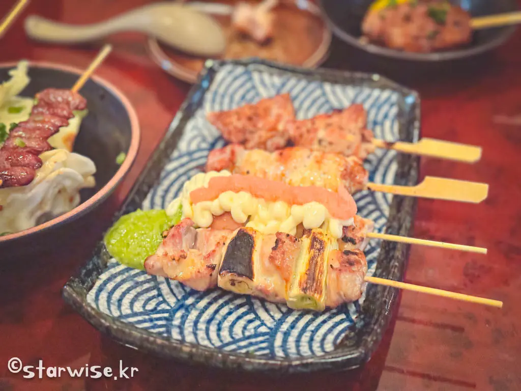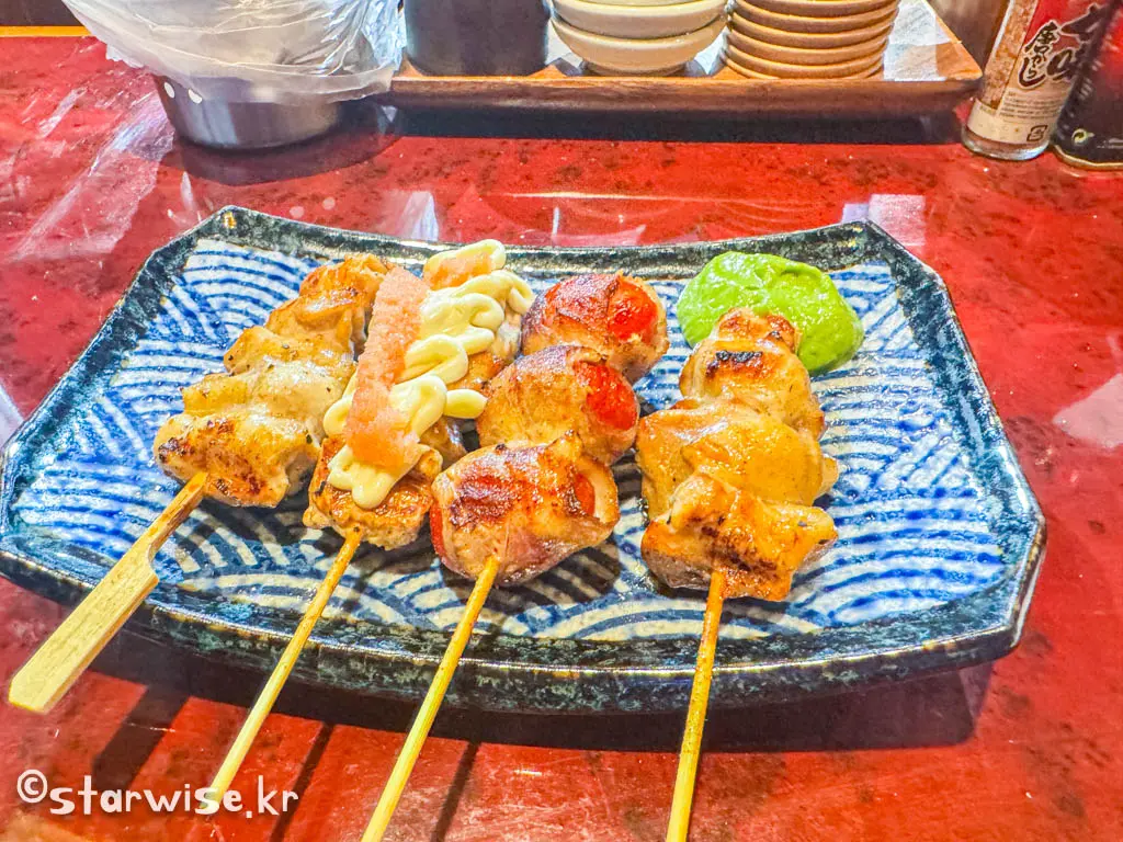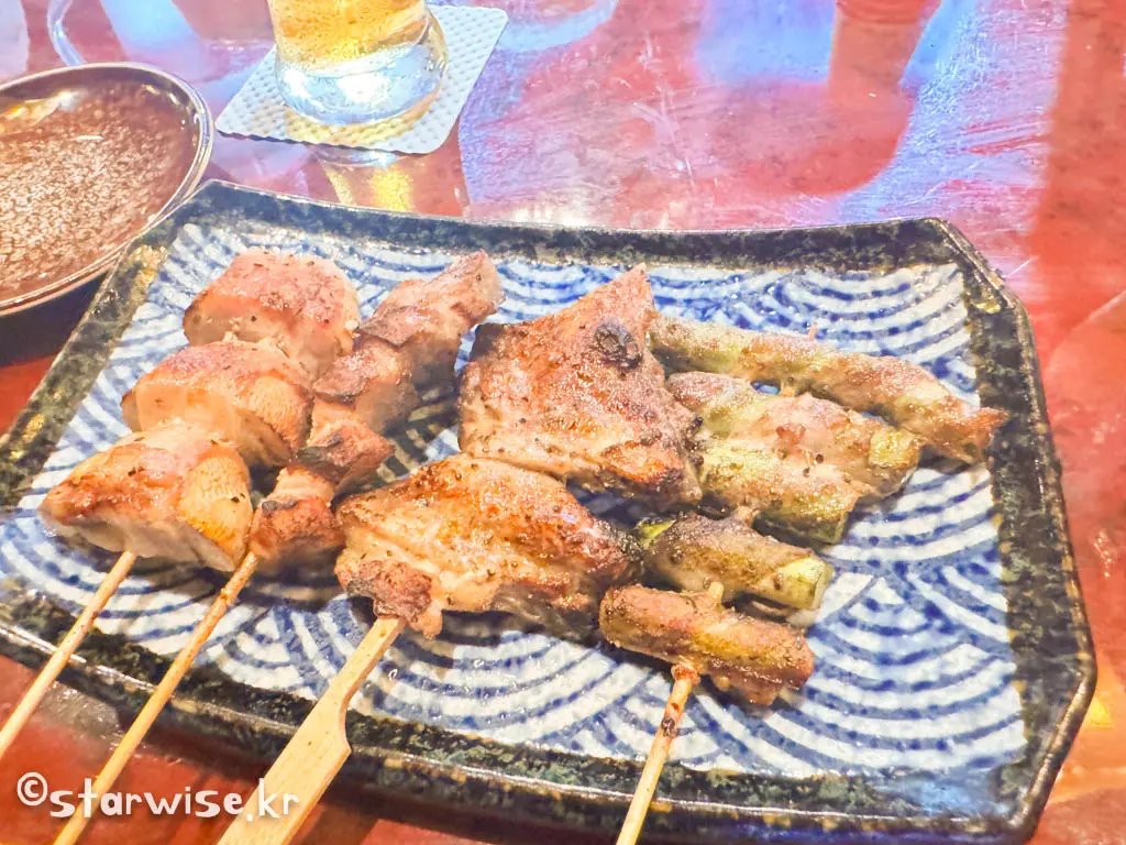야키토리는 간장 소스나 소금으로 간을 해서 굽는 두 가지 스타일이 있으며, 다양한 부위와 맛을 즐길 수 있는 전통적인 일본식 요리입니다