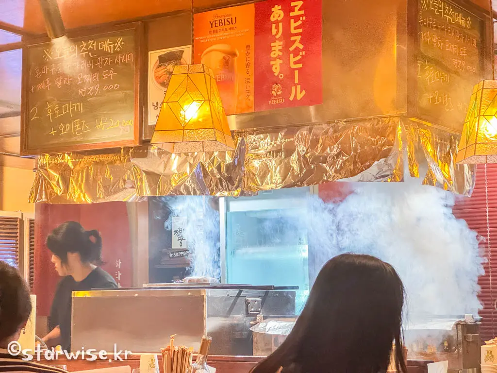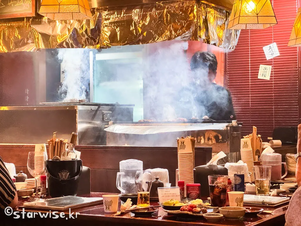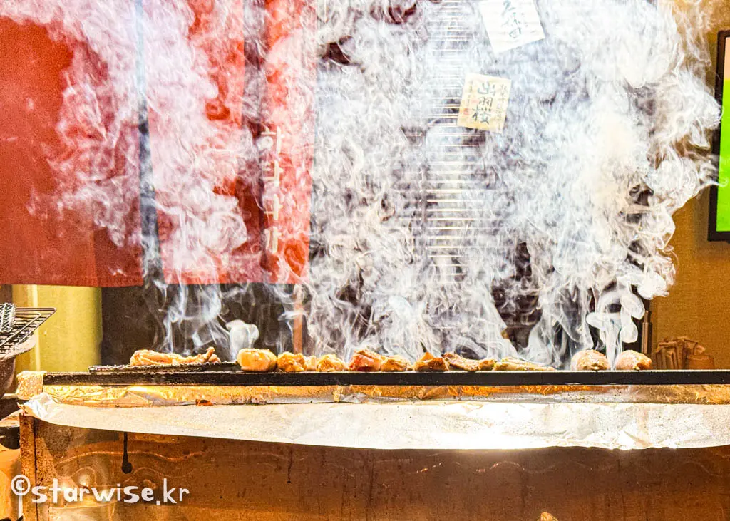 술을 한 두잔 걸치다 보면 눈앞에서 열심히 움직이는 직원분들과 꼬치구이를 열심히 굽고 있는 요리사분의 열정이 느껴진다. 보통 야키토리집을 가면 저렇게 연기가 나지는 않는데 이곳에서는 구워지는 동안 식재료들의 수분증발을 막기 위해 굽는 중간중간에 물을 뿌리기 때문에 저렇게 자욱한 연기가 나는 것을 볼 수 있다. 환풍 시스템이 잘 되어 있기 때문에 가게 내부가 뿌옇게 변하는 불상사가 일어나진 않는다.