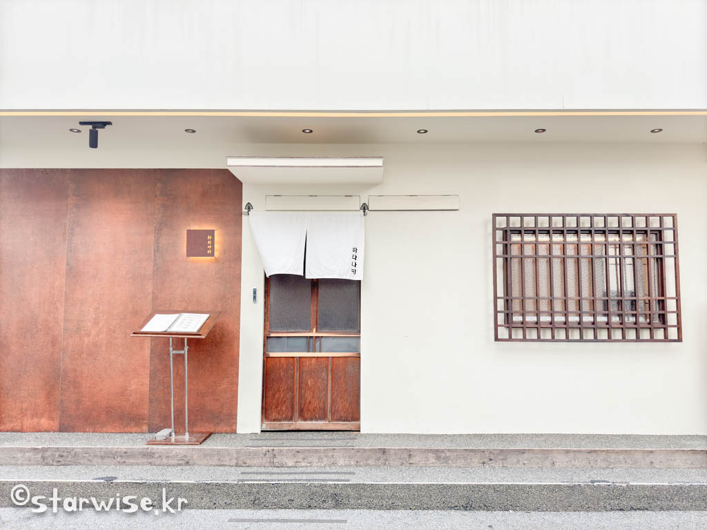 이 곳의 유일한 단점을 꼽자면 주차장을 꼽을 수 있다. 정말로 좁은 골목 한가운데 그저 '툭'하고 아무런 특징도 없이 그냥 흰색 벽과 나무로 만들어진 문(그래도 자동문이다.), 그리고 천막 (노렌: 暖簾)만이 이 곳이 운영하는 식당임을 알려주고 있다.