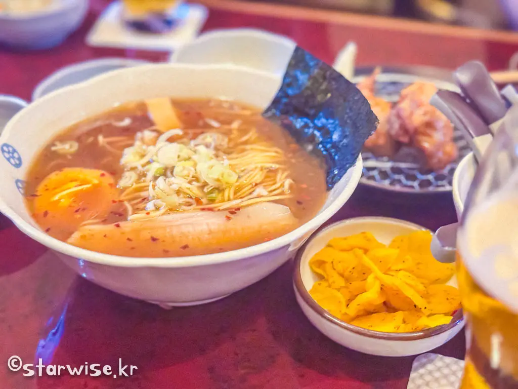 기다리다 지쳐서 먼저 배를 채우기 위해 라면과 가라아케(닭튀김)을 주문해 보았다.