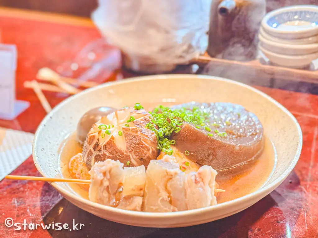 같이 간 일행과 오랫동안 얘기하다 보니 어느새 다시 배가 고파와 졌다. 무엇을 주문할까 하다가 이번에는 기름진 음식이 아닌 스지와 어묵을 주문했는데 이 것 또한 별미였다. 간이 세지도 약하지도 않은 적절한 밸런스, 너무나도 간이 잘 베인 무.. 그리고 타마고(계란). 평상시에 냄새가 싫어서 안 먹는 표고버섯도 푹 고아서인지 전혀 냄새나지 않고 쫀득한 식감만이 남아있어 너무나도 좋았다.
