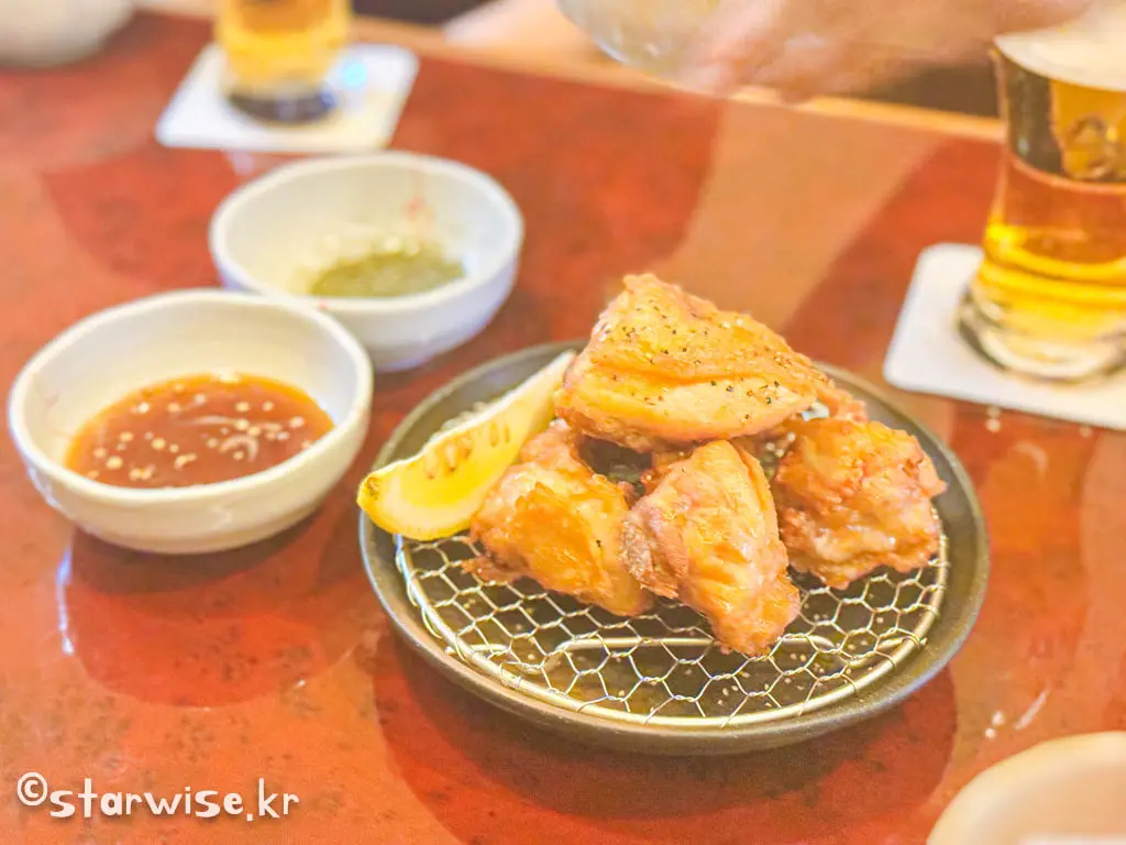 닭튀김은 알고 있는 흔한 맛이긴 하지만 겉바속촉의 정석을 보여준다. 닭살의 탱글탱글함은 잡아주면서 튀김 표면은 '아사삭'소리가 날 정도로 느끼하지 않은 바삭함이 돋보인다. 레몬을 살짝 뿌려먹거나 간장/고추냉이를 찍어 먹으면 맥주잔이 두 잔이 되고 세잔이 되는 것은 시간문제다.