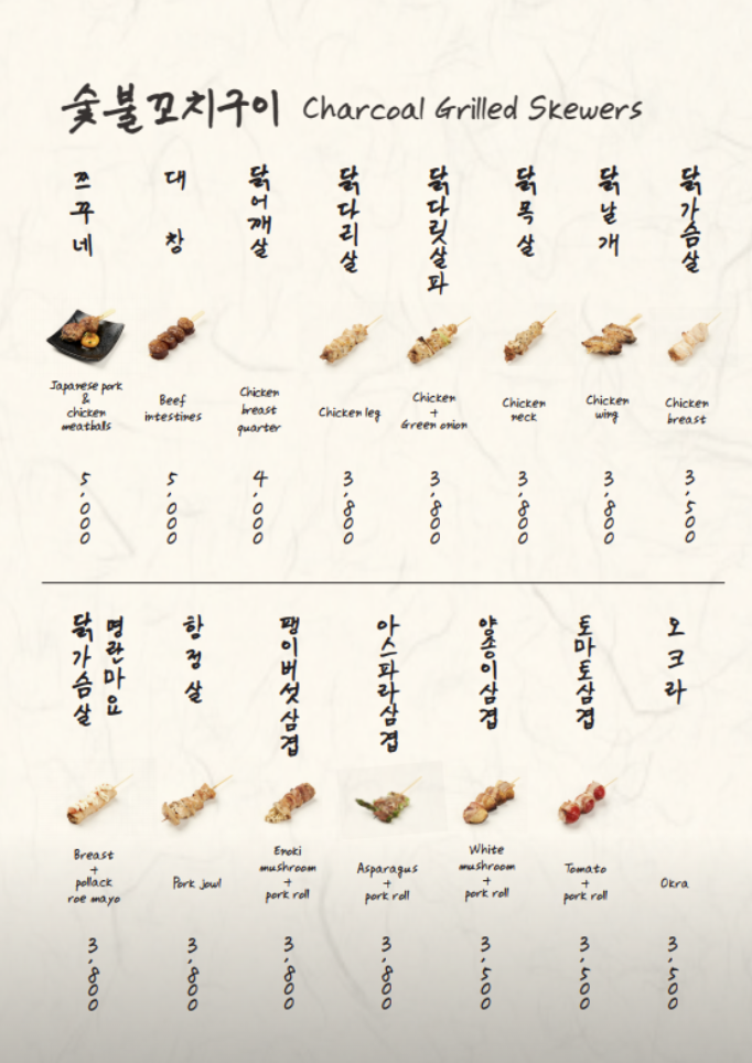 정말 맛있다. 숯불의 향이 은은하게 배어 있으면서 재료들 하나하나가 바삭은 하되, 퍽퍽하진 않은.. 수분은 잘 잡아주고 겉은 적절히 익은 재료들이 너무나도 조화롭다. 가격이 아주 비싼 편은 아니지만 마치 오마카세 꼬치구이를 먹는 것 같은 고급진 느낌이 난다. 인기 있는 저녁시간에 한자리도 비어 있지 않는 이 공간에서 앞에서 꼬치구이의 굽는 소리가, 옆에서는 맛있는 음식과 함께하며 즐거워하는 사람들을 바라보며 이 공간을 느끼고 있으면 5% 부족하긴 하지만 정말로 일본의 이자카야를 온 듯한 기분이 들어 신기할 따름이다. (부족한 5%는 감성..? 그리고 일본어?ㅋㅋ) 정말 정말 추천하는 꼬치구이이다.