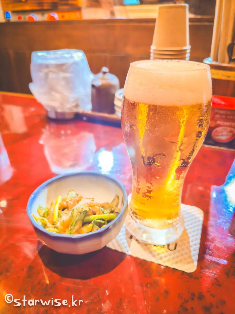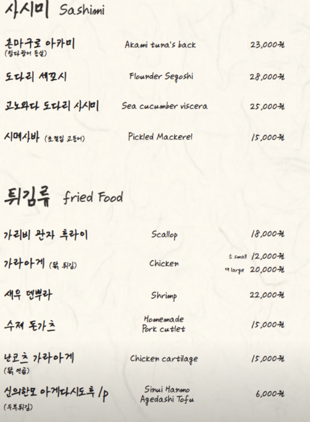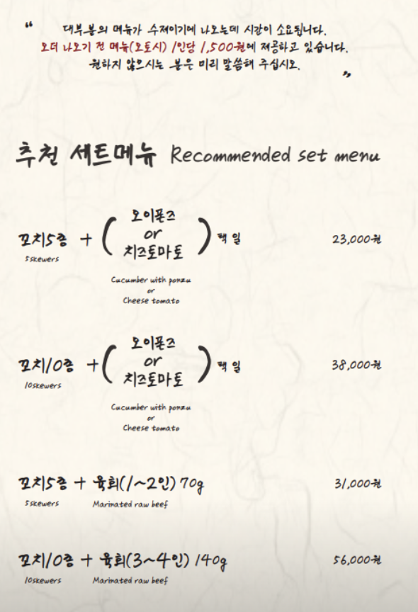 진짜 일본의 이자카야와 같이 유료 기본안주인 오토-시(식전 애피타이저 같은 미니 요리)를 선택할 수 있는데 가격이 1500원 밖에 안 하기 때문에 음식이 나오기 전 생맥주 한 잔과 함께 먹기 좋은 음식이다. 처음 오는 사람이라면 메뉴의 첫 번째 사진에 나와 있는 꼬치 세트메뉴를 주문하길 추천한다.