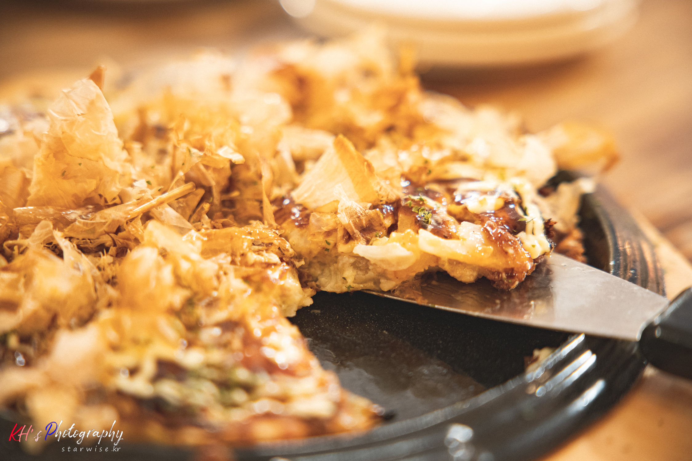 일본식 파전답게 위에 엄청나게 수북히 가쓰오부시가 얹혀져서 나온다. 두께는 적당하게 나오고 소스도 풍부해서 군침이 도는 맛이다.