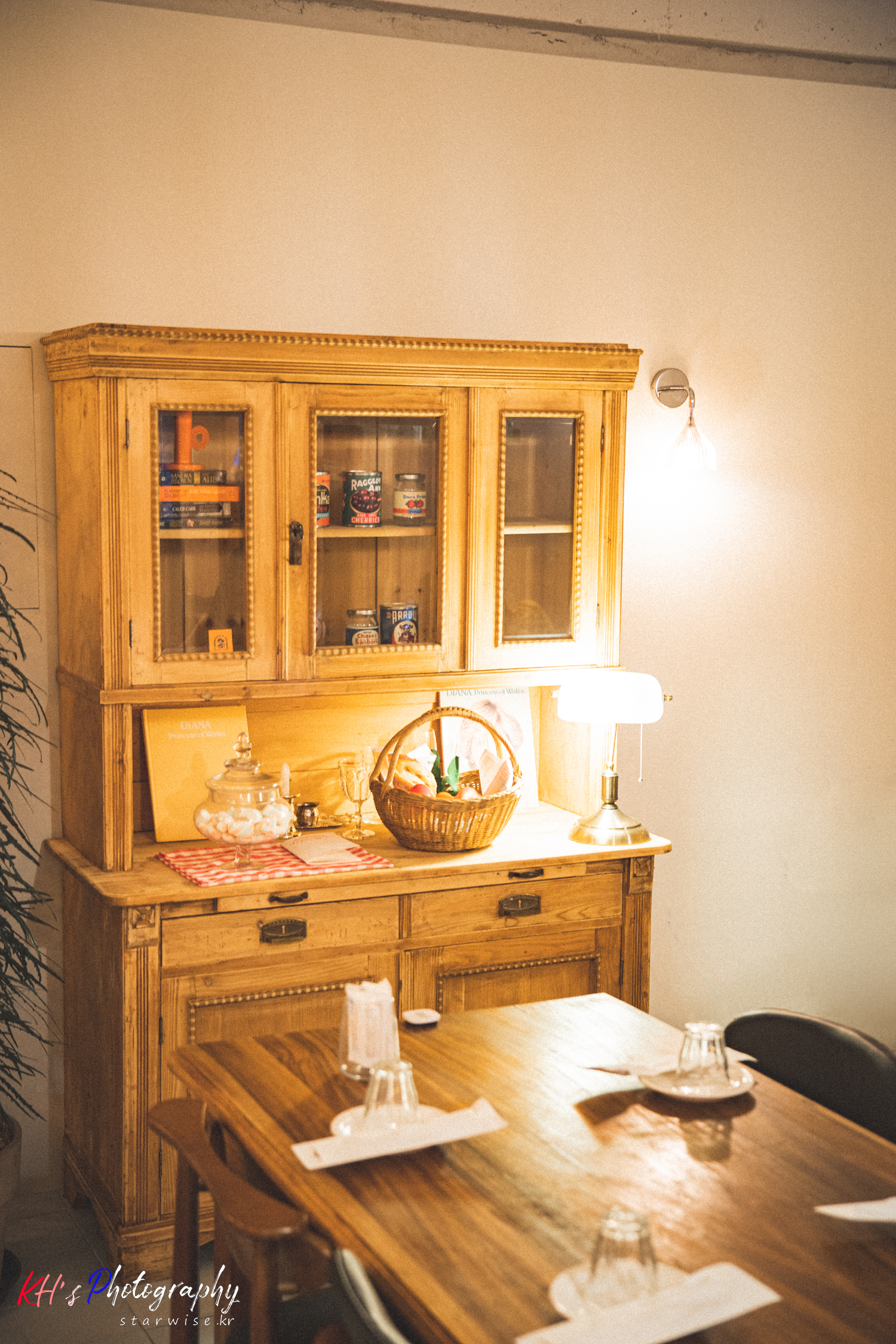 음식점은 이렇게 코너에 위치하고 있는데 아주 화려하게 외관을 꾸민 게 아니라서 그냥 무턱대고 네비게이션만 보고 가다가는 놓치기 쉬운 위치이다. 낮에 가도 좋지만 저녁에 가면 더욱 분위기 있어지는 이 곳이다. 가게 안은 좌석이 많지는 않다. 그래서 더더욱 예약이 필수인 이유이다. 방문했을 때가 평일이였음에도 불구하고 저녁 식사시간대에는 거의 만석에 가까웠다. 나는 미리 그 사실을 알았기에 예약을 했는데 그 덕분인지 3명이서 방문했음에도 불구하고 6인용 테이블을 배정해주셔서 아주 넓게 식사를 할 수 있었다. 식사를 주문하고 나오기 전까지는 가게 안의 멋진 소품들과 인테리어를 구경하고 있으면 된다. 컨셉은 아마, 7~80년대 미국 중산층 가정집을 모티브로 한게 아닐까 하는 생각이 드는 고풍스러움이 느껴진다.