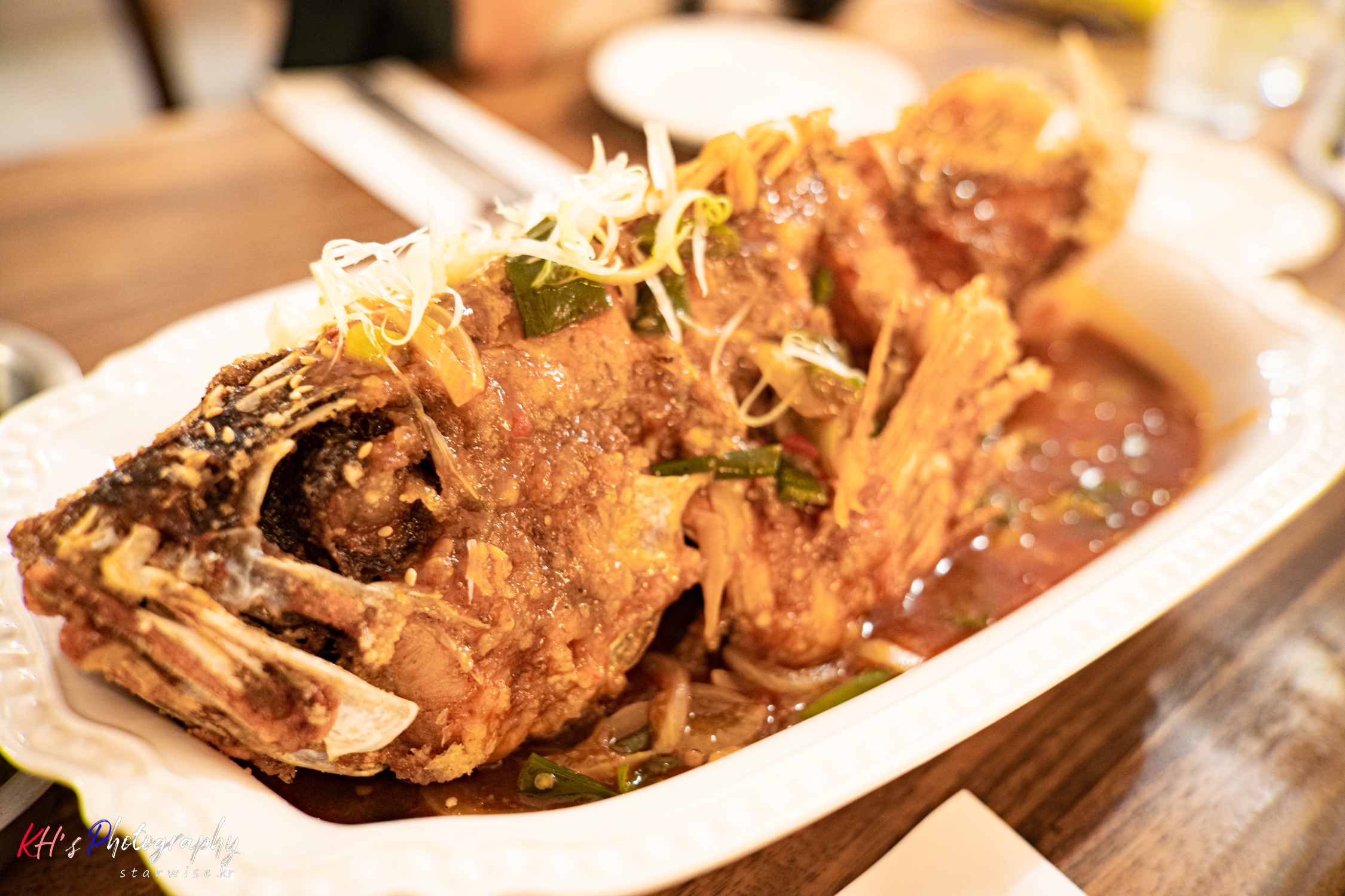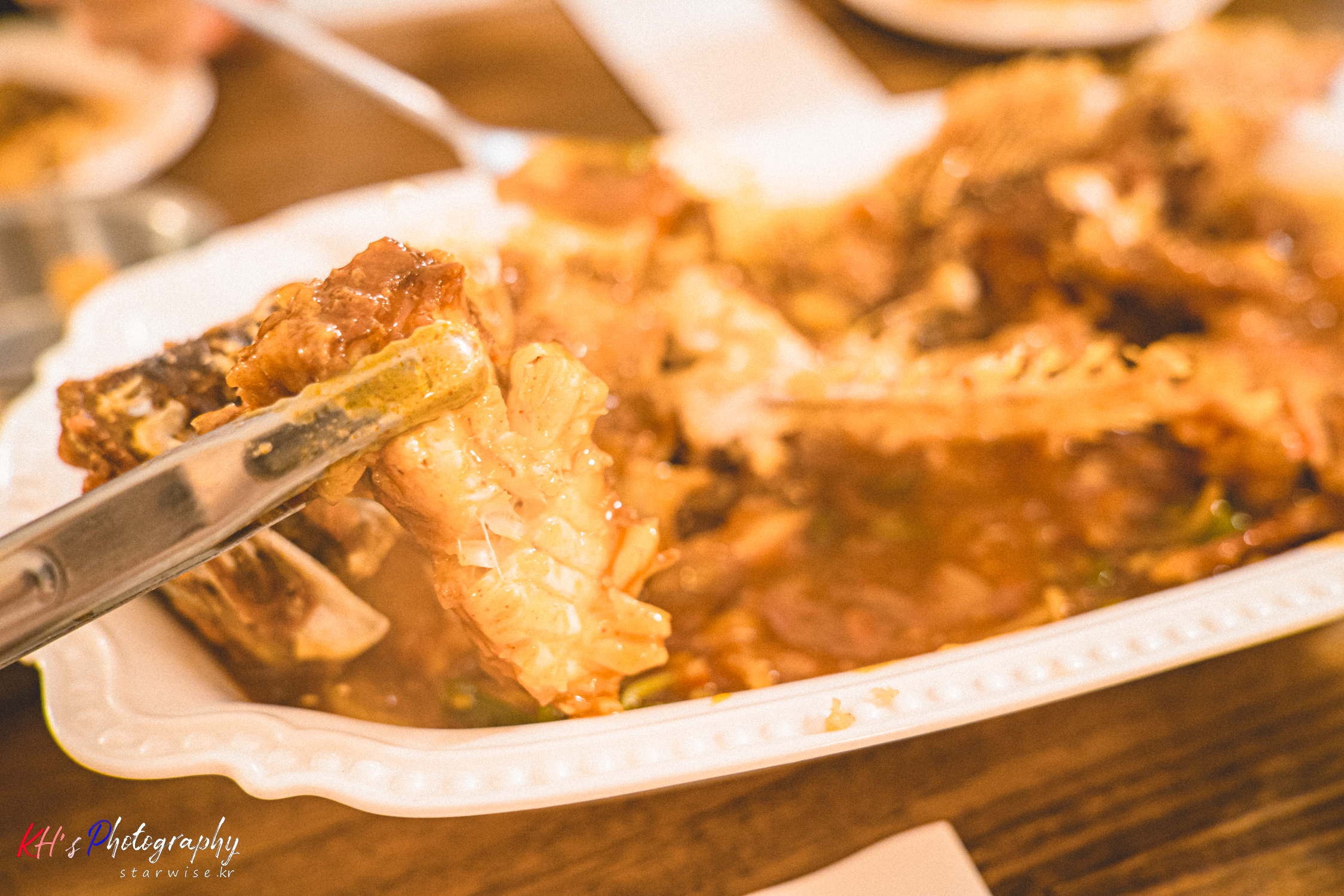 맛을 위해서인지 생동감(?)을 위해서인지는 모르겠지만 우럭이 정말 완전 기초적인 손질만 된 상태로 통으로 튀겨져서 나오기 때문에 우럭의 뼈도 그대로 있다. 그래서 제대로 먹기 위해서는 해체쇼를 한번 샤샤삭 해줘야한다. 다행히 사전조리를 잘 해놓아서인지 살과 뼈는 쉽게 분리되는 편이고 같이 나오는 소스를 한번 스윽~ 위에 부어주면 노오란 조명과 합쳐져 윤기가 좔좔흘러서 아주 먹음직스럽다.