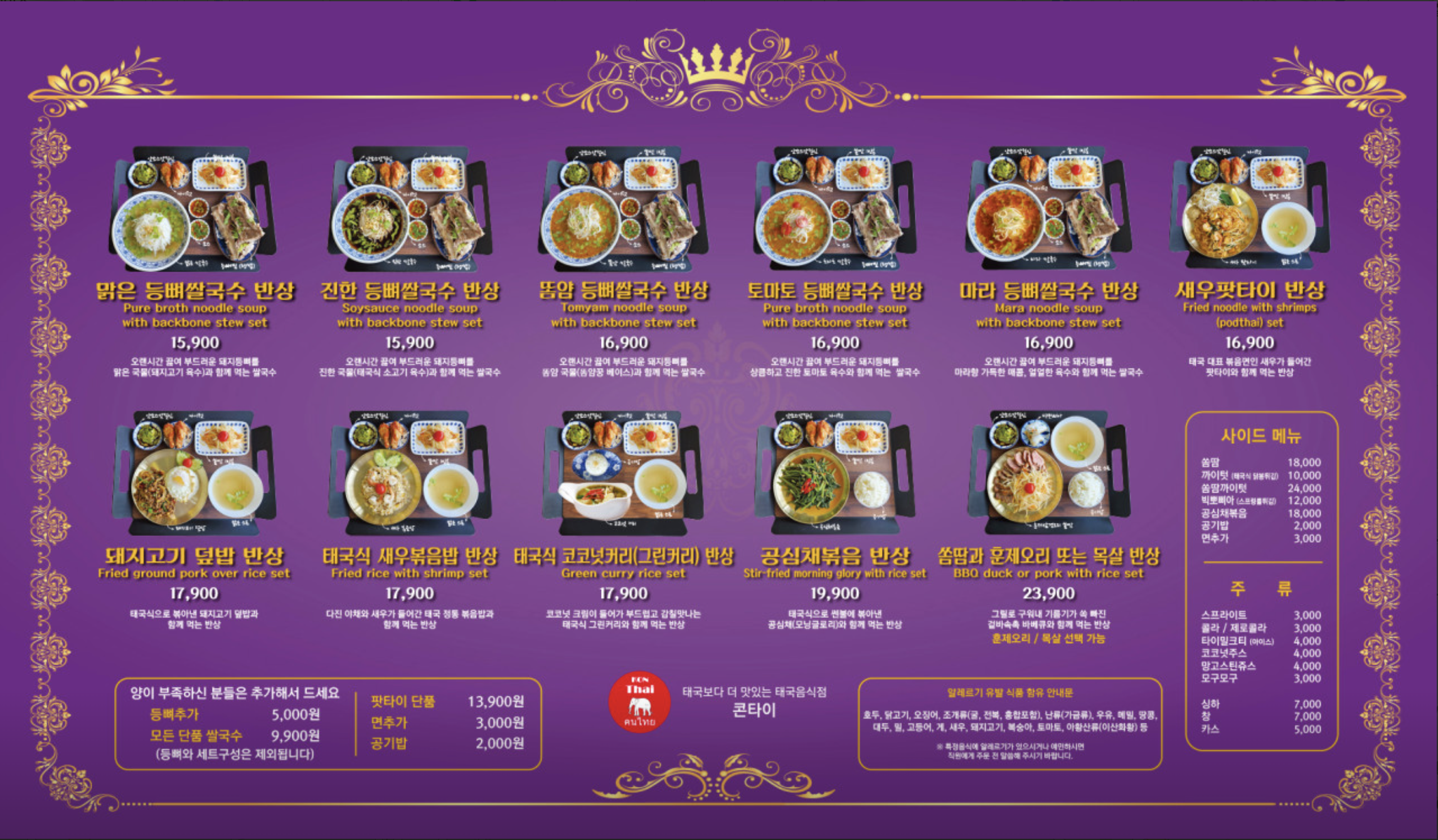 소제목에도 적었다시피, 내가 원하는 메뉴만 딱딱 골라서 먹을 수 있었으면 참 좋았겠지만, 이 곳은 거의 세트메뉴로 이루어져 있다. 물론, 팟타이 단품 그리고 몇 가지 사이드메뉴가 있긴 하지만 많이 아쉬운 부분이었다. 가격은 10,000~24,000까지였는데 살짝 비싼 감이 있긴 했지만, 쇼핑몰 안에 입점해 있다는 점을 감안할 때 (서울의 쇼핑몰 내부 음식점들 대비) 이해할 수 있을만한 수준이었다.