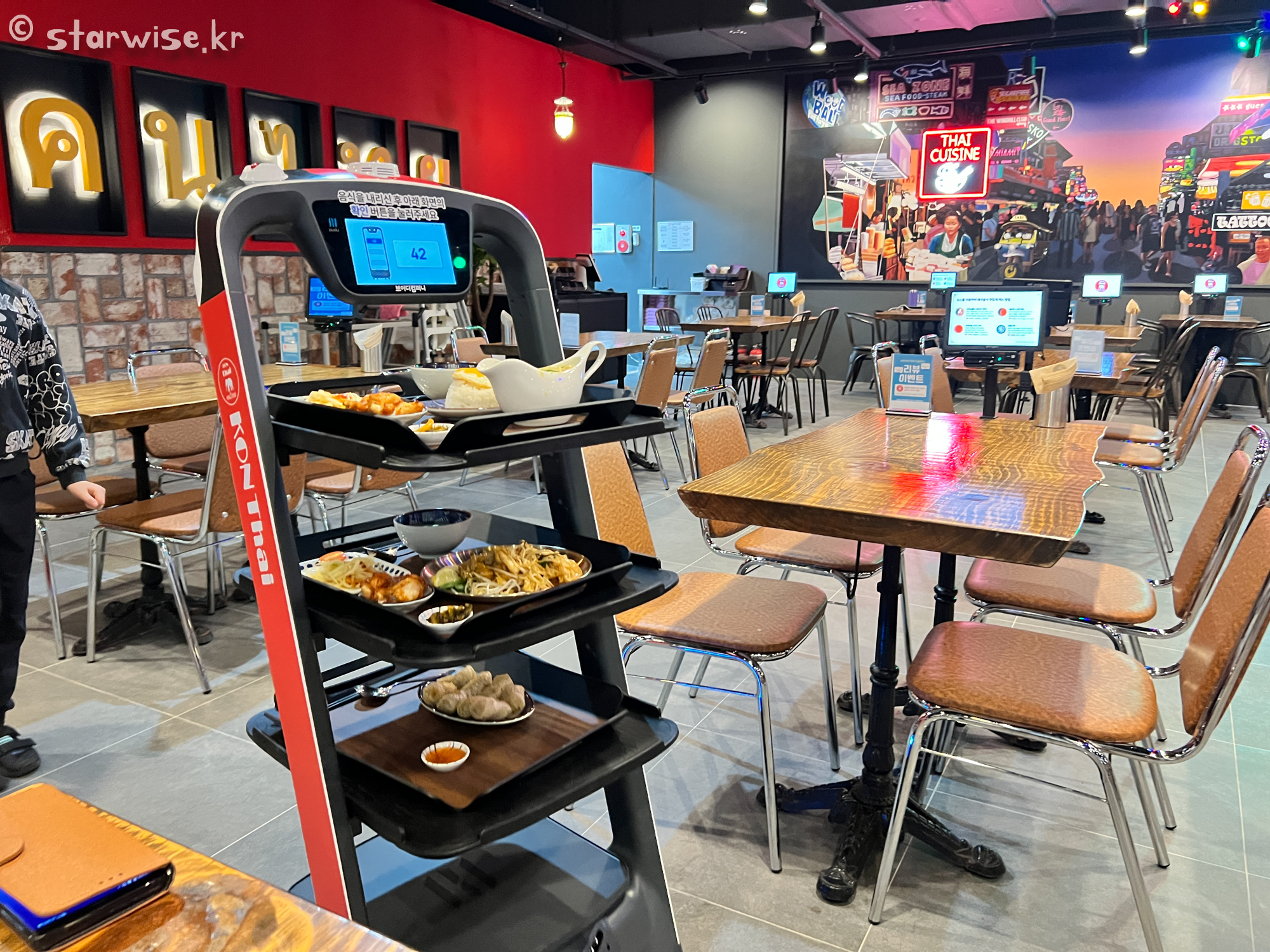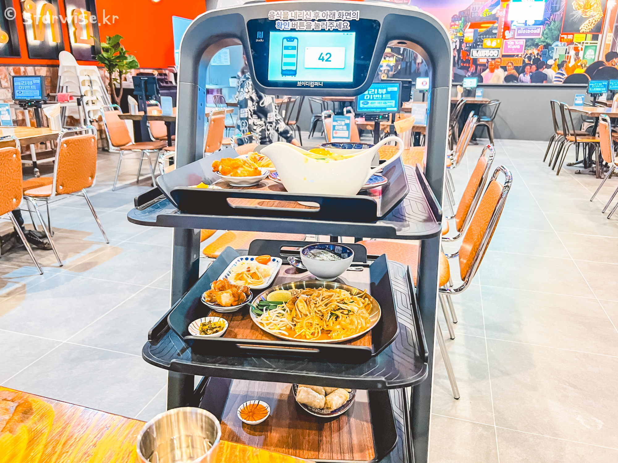 홀의 크기에 비해서 저녁시간대임에도 홀 담당하시는 분이 1분 밖에 없었기에 자동화된 기계가 음식을 배달해 주었다.