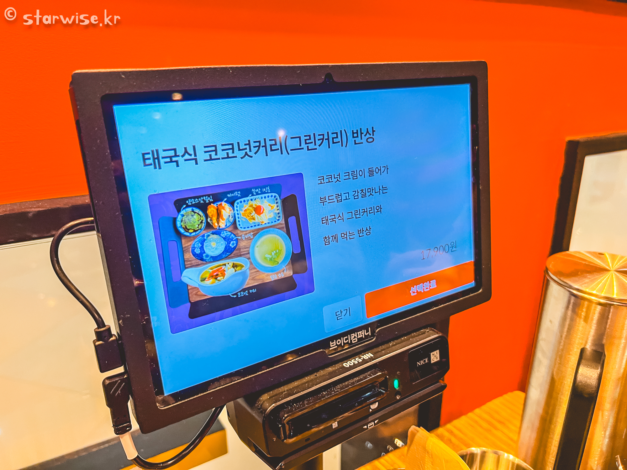 왠지 다른 타이 음식점에서 먹을수 있을만한 이상한 한국화 된 메뉴가 아닌, 태국전통 요리를 맛보고자 했기 때문에 이번 방문에는 새우팟타이 반상 / 태국식 코코넛커리 반상 / 빅뽀빠이(스프링롤튀김)를 주문해 보았다. 주문은 테이블에 마련된 키오스크를 이용해서 주문이 가능하다.