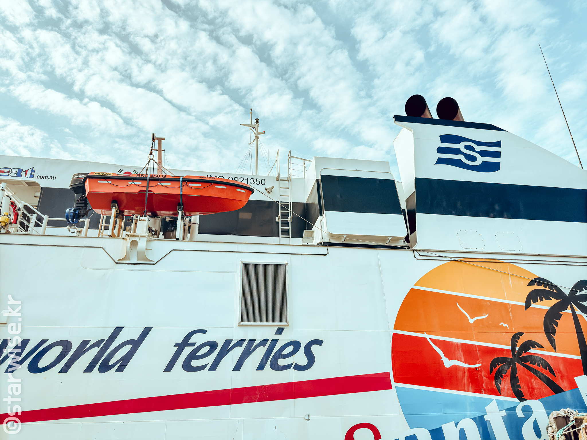 "안내말씀 드립니다. 승용차와 바이크, 자전거를 가지고 온 손님께선 지금 즉시 배 뒤쪽 출구로 나와 화물칸으로 이동해 주시기 바랍니다."
