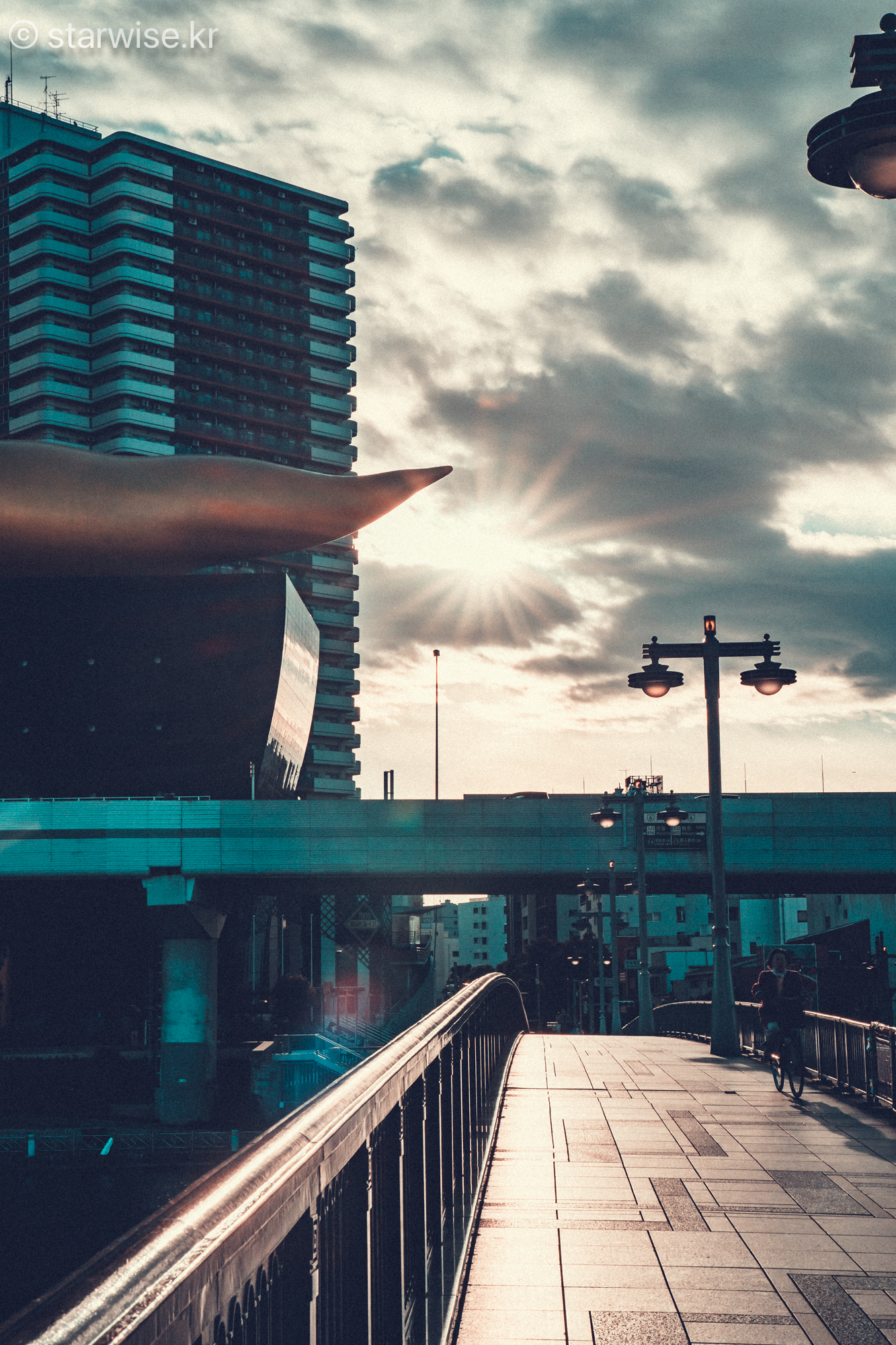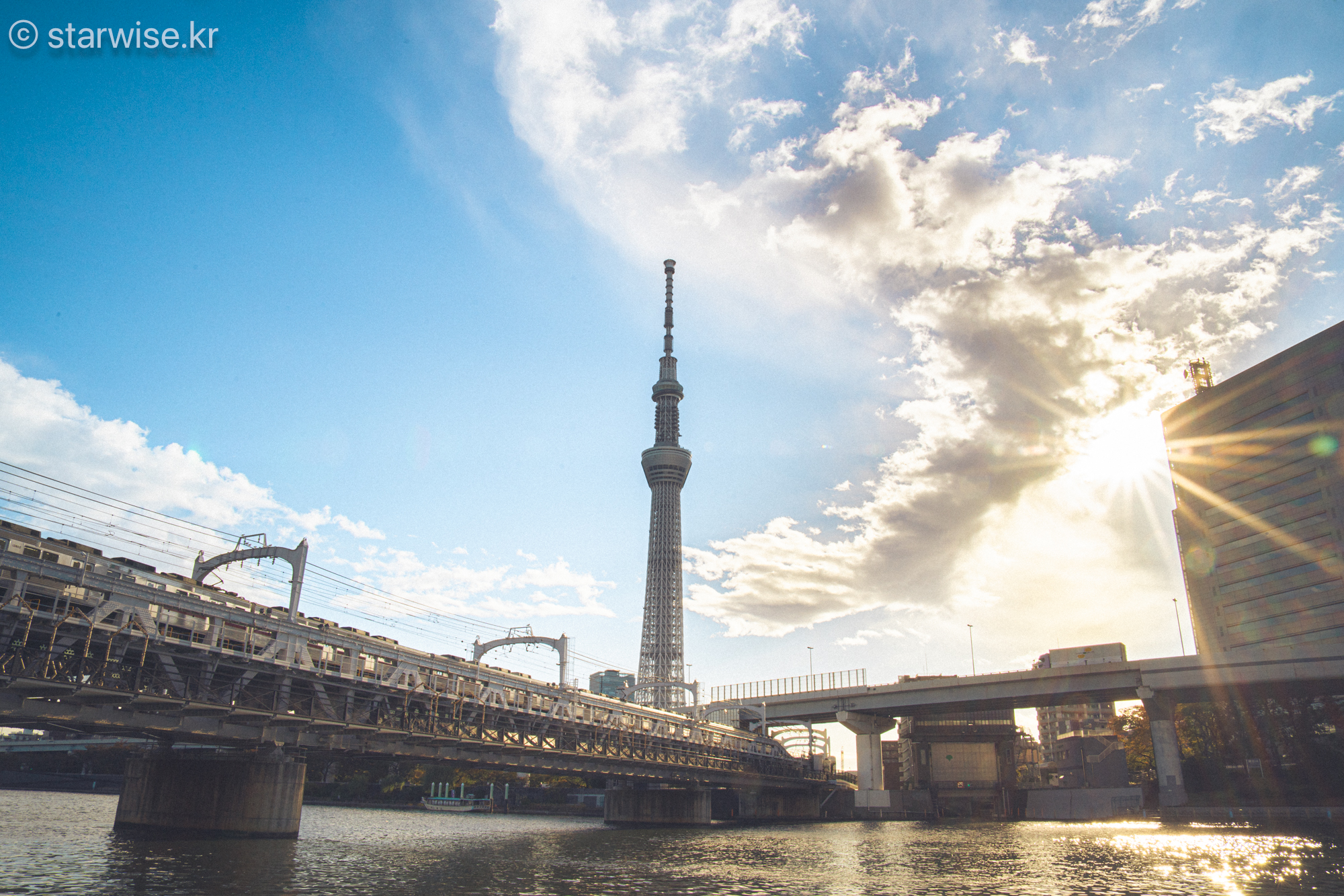 센소지는 계속 자고 있었기 때문에, 조금이나마 활기찬 기운을 찾아보기 위해 도쿄의 중심가를 가로지르는 강, '스미다 강'을 향해서 산책을 시작해 본다. 그리고, 스미다 강을 향해 가면 갈수록 '아사히맥주 본사'빌딩과 '스카이트리'가 점점 더 크게 보인다. 그리고 아침의 따스한 햇살이 그 사이로 빛을 내뿜어오고 있었다.
