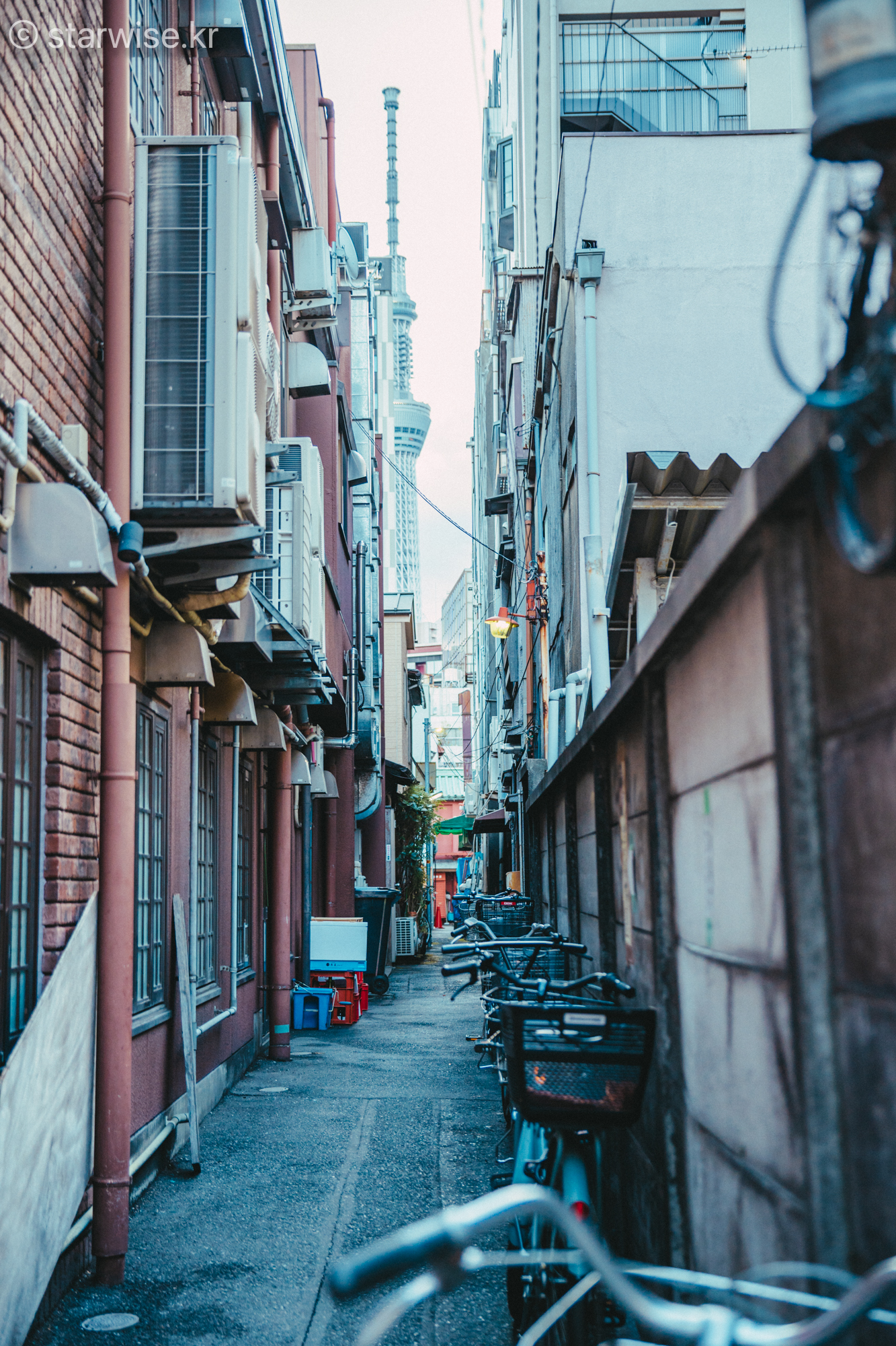 센소지는 계속 자고 있었기 때문에, 조금이나마 활기찬 기운을 찾아보기 위해 도쿄의 중심가를 가로지르는 강, '스미다 강'을 향해서 산책을 시작해 본다. 그리고, 스미다 강을 향해 가면 갈수록 '아사히맥주 본사'빌딩과 '스카이트리'가 점점 더 크게 보인다. 그리고 아침의 따스한 햇살이 그 사이로 빛을 내뿜어오고 있었다.