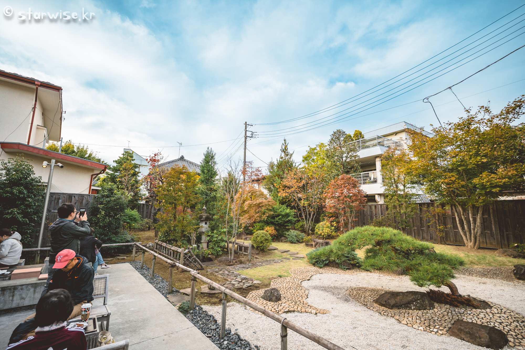 마침 너무나도 지쳐버린 몸을 카페 안에서 좀 녹이면서 손에서 폰을 놓고 소위 말하는 "멍때리기"시간을 가졌다. 여유시간을 2시간이 주었기 때문에 저녁식사를 할 수도 있었겠지만 별로 배가 고프지 않았다. 그래서 그냥 음료나 마시면서 멍하니 바깥 풍경과 사람들이 지나다니는 모습을 구경할 수 있었다. 어느 정도 충전을 완료하고, 일어나 볼까..? 하는데 마침 스타벅스의 뒷마당이 눈에 들어온다. 그냥 단순 카페만이 아니라 일본 에도시대의 집처럼 뒷마당 정원이 만들어져 있던 것이다.