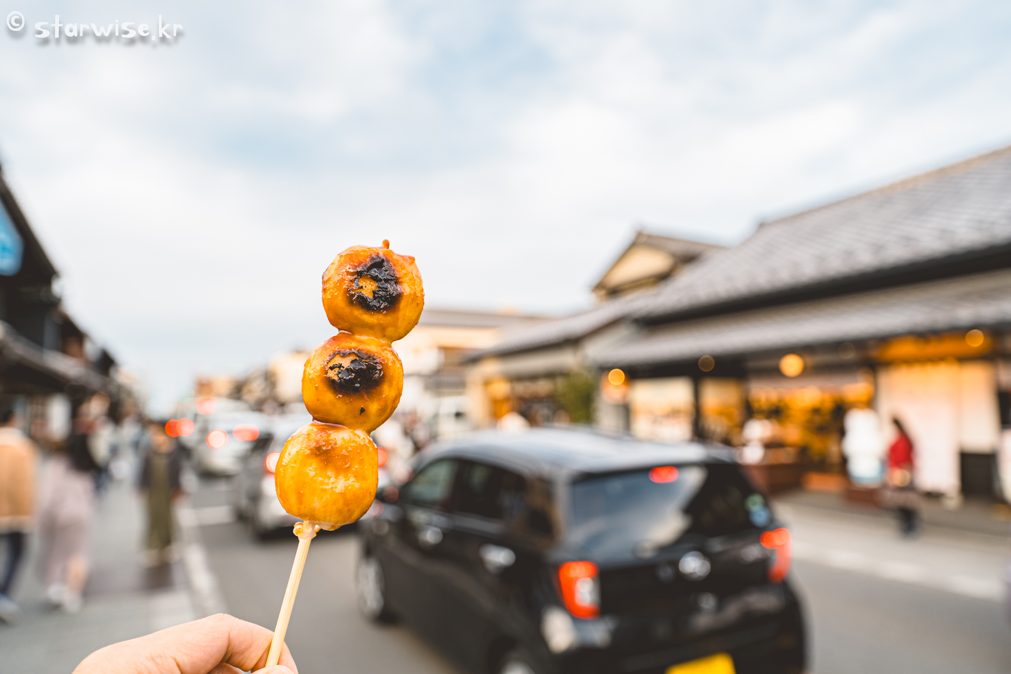 스타벅스를 나서고, 바깥거리를 둘러본다. 아까보다 구름이 많이 들어와 있었다. 생각 없이 길거리를 걷고 있는데 순간 맛있어 보이는 간식이 눈에 확! 하고 들어온다. 일본에 와서 한 번도 안 먹어본 "당고(団子)" 달달한 설탕을 바른 떡....그이상 그 이하도 아니다. 그냥 쫄깃하면서 달콤 짭짜름한 맛이다. 그래도 거리 걸으면서 먹으니 재미있는 기분은 들었다.