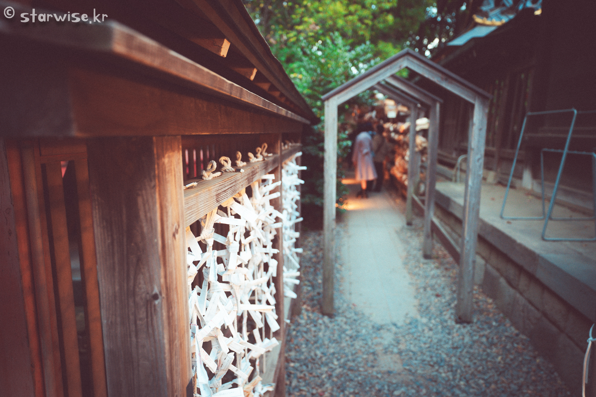 그냥 다른 사람들처럼 길거리 여기저기를 다니면서 상점가들을 구경할 수도 있었겠지만, 무엇인가 남들이 가보지 않는 곳을 방문해보고 싶었고, 마치 만들어진 거리 같은 관광지용 상업구역을 넘어서 이 근처를 살아가는 일본인들의 생활 상에 녹아들고 싶었다. 그래서 5분 정도의 거리에 위치한 신사인 "카와고에 히카와신사 川越氷川神社"로 발걸음을 옮겼다. 신사로 가는 길은 정말 그냥 일본 동네의 모습이었다. 흥미로웠던 점은 좁은 골목 옆에 조그맣게 접은 종이들이 걸려있는 미니 기도공간도 있었다는 점이다.