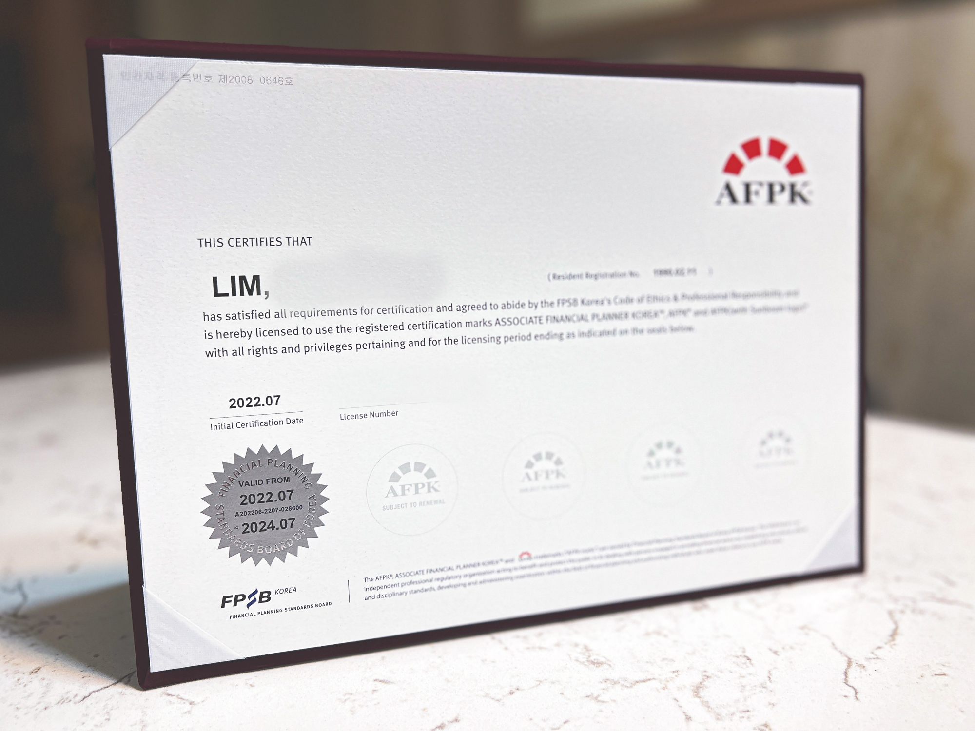 무려, 11만원이나 내고 (시험비가 약 7만원이니 총 18만원.. 내가 처음에 돈이 들어가는 자격증이라 하는 이유다..!!) 2년간 자격인증을 받았다. 그리고 약 3주가 지나서 한국 FPSB로부터 띡 하고 소포가 하나 도착했다.